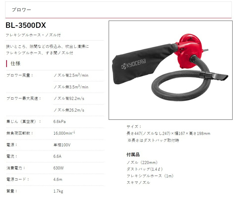 京セラインダストリアルツアーズ株式会社ブロワBL3500DXフレキシブルホース・ノズル付狭いところ、隙間などの吸込み、吹出し清掃にフレキシブルホース、すき間ノズル付■仕様・ブロワー風量:ノズル有2.5m3/min・ノズル無3.5m3/min・ブロワー最大風速:ノズル有92.2m/s・ノズル無26.2m/s・集じん(真空度):6.6kPa・無負荷回転数:16,000min-1・電源:単相100V・電流:6.6A・消費電力:630W・電源コード:4.6m・質量:1.7kgサイズ:長さ447(ノズルなし247)×幅167×高さ198mm ※長さはダストバッグ取付時■付属品・ノズル(220mm)・ダストバッグ(1.4?)・フレキシブルホース(1m)・スキマノズル