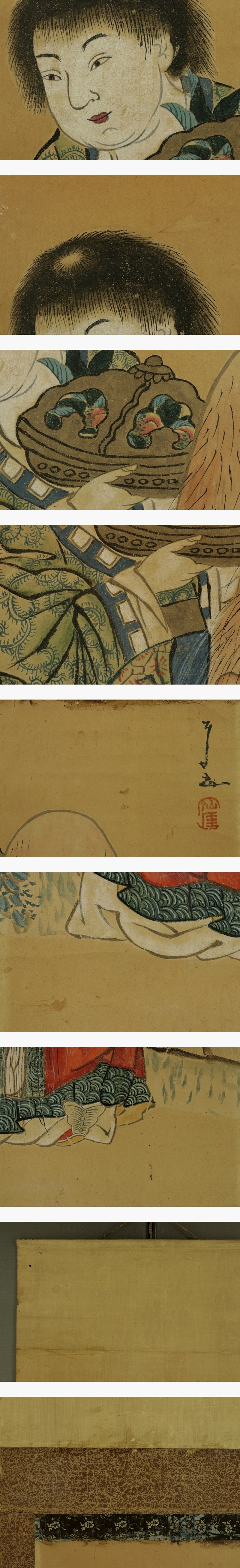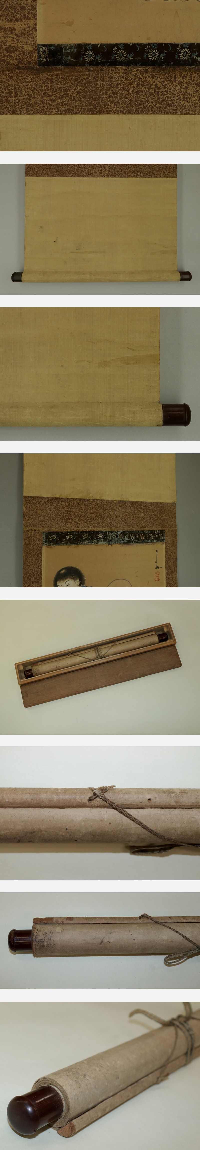 仙厓義梵 せんがい-ぎぼん(1750-1837) 江戸時代の臨済宗古月派の禅僧、画家。 美濃国武儀郡で生まれ、11歳の頃清泰寺で臨済宗の僧となった。 19歳になり行脚の後に月船禅彗の門下に入る。 39歳より博多の聖福寺の盤谷紹適の法嗣となる。 仙厓の絵は生前から人気があり、一筆をねだる客が絶えなかった。 83歳の時、庭に「絶筆の碑」を建て断筆宣言をしたが結局やめられず、没年まで作品は残っている。 本紙は、染み、汚れ、強い折れ、強い皺、虫食い、擦れ、ヤケ、時代感があります。 表装は、染み、汚れ、強い折れ、強い皺、虫食い、破れ、くすみ、擦れ、 軸先に汚れ、軸紐に劣化があります。 【サイズ】 作品 横約36cm×縦約55cm 表装 横約45cm×縦約156cm |