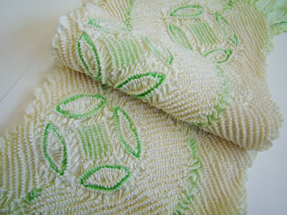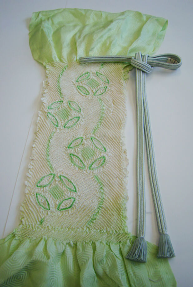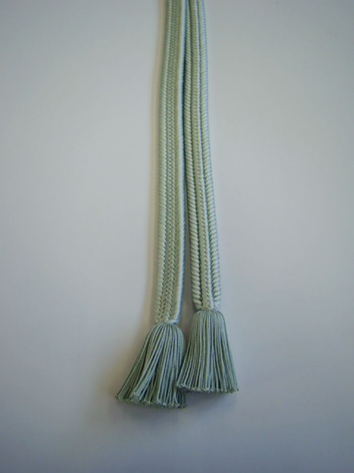 ●帯揚: 正絹。 夏虫色地に象牙色ぼかしに七宝柄に絞り柄 長さ114cm 幅15cm (絞った状態での寸法です) ●帯〆: 正絹。 白花色地のゆるぎ組紐により房付き 長さ140cm 幅1.0cm |
