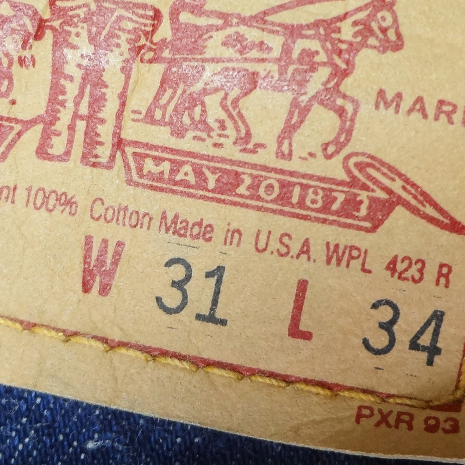 ・スモールeレッドタブ、アーキュエットステッチ、MADE IN USA表記入りペーパーパッチ、ジップフライ、5ポケットリベット、トップボタン裏刻印501