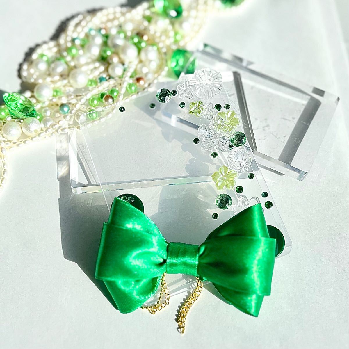 トレカケース トレカケースカバー デコトレカ トレカデコ トレカケースデコB8 ダイヤ バラ ローズ ゴールド ストーンデコ ラインストーン 花 カボション パーツ フラワー シフォン ホワイト グリーン 緑 リボン フリル パール チェーン 花びら