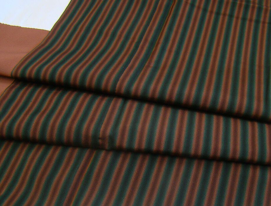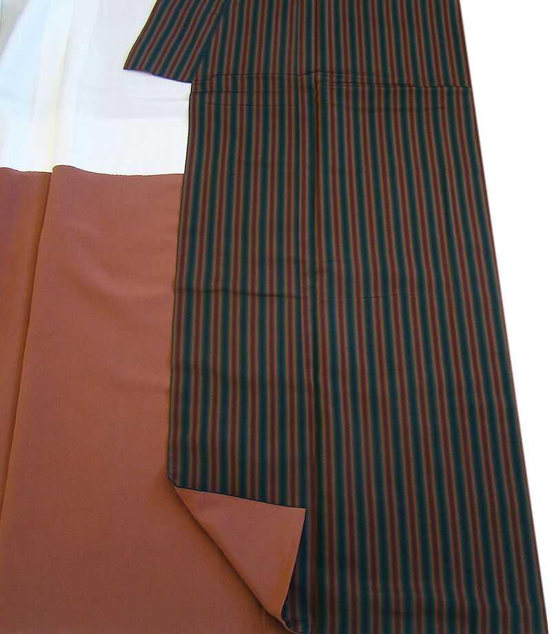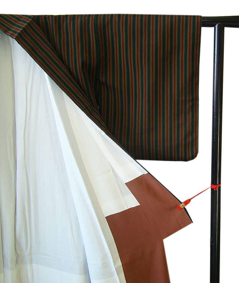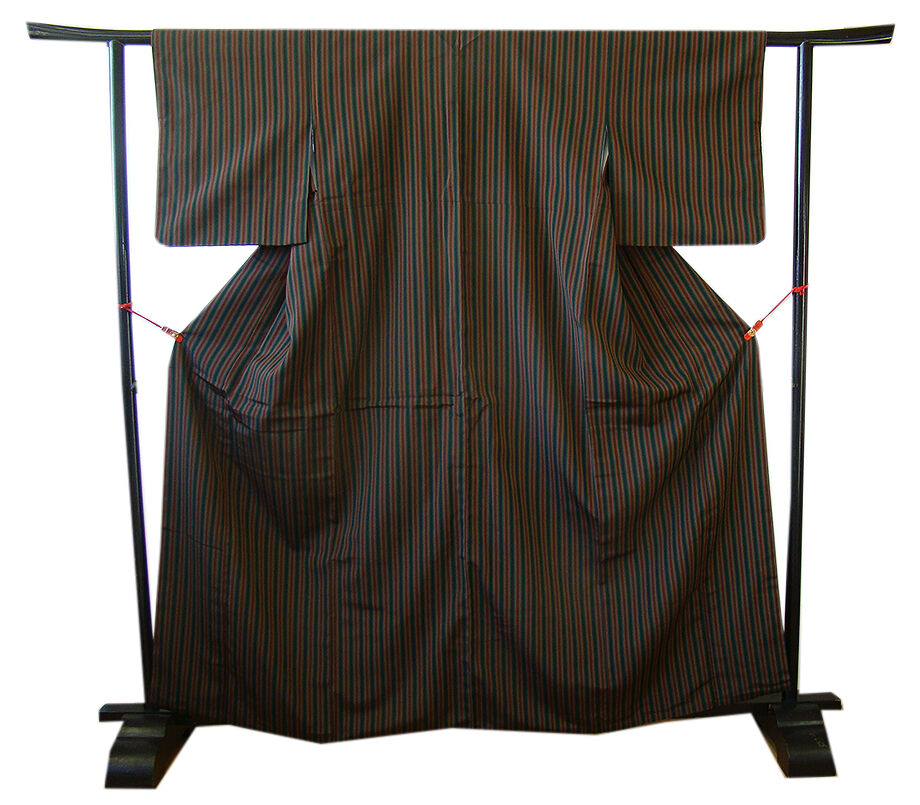 商品説明 | こちらのお品は「袷」ですので10月から5月までお召頂ければと思います。 とてもしなやかなさらりとした手触りの着心地良い重めのちりめん地の生地、 緑、茶、こげ茶色の棒縞柄の染柄、 八掛は蘇芳香色(正絹)、幅広い年代の方にお召頂けます。 |