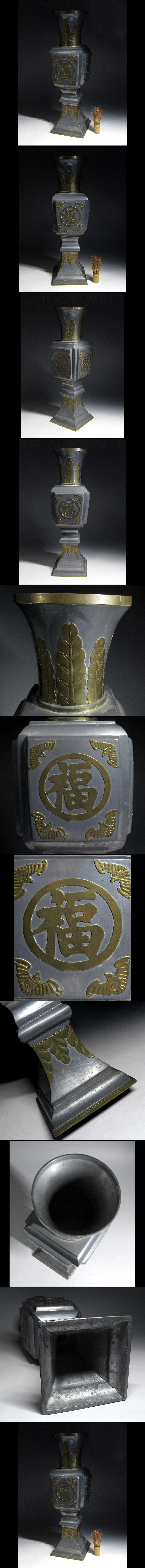緑屋s■ 中国古玩 古錫 鍍象嵌 四稜 大花瓶 壺 高約46.5cm 唐物 時代物 i9/3-6819/8-2#100 收藏