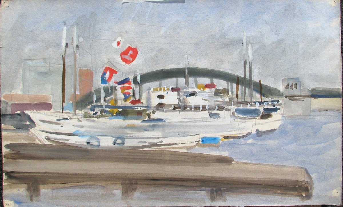 二科会員,水彩大家,仁戸田秀吉,停泊風景,5号大、水彩,額なし,茨城県近代美術館収蔵,掘出物
