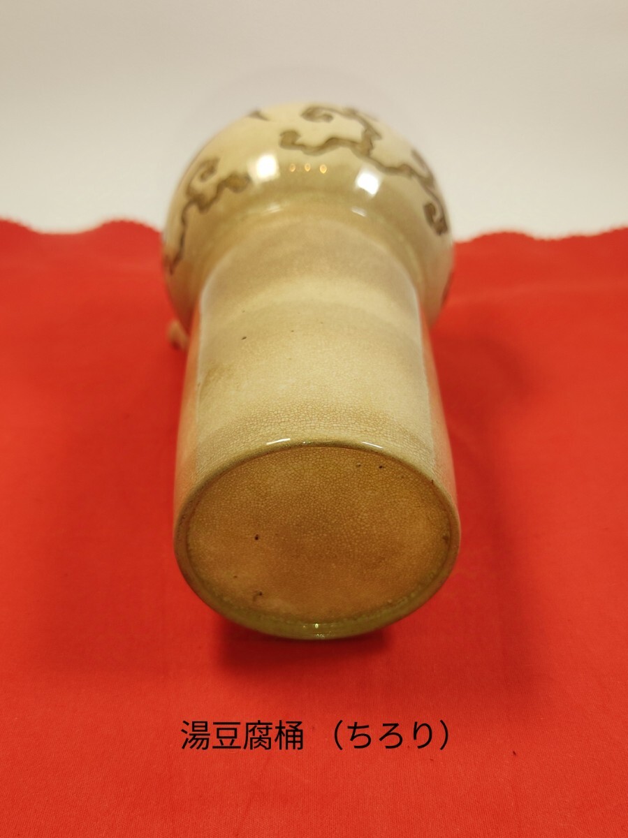 京都の冬の味覚、湯豆腐をより一層楽しむための陶器製のちろりです。急須のような形をしており、湯豆腐のタレや日本酒などを入れて、鍋で温めることができます。風情あるデザインと、温かみのある木製の台(はかま)がセットになっています。