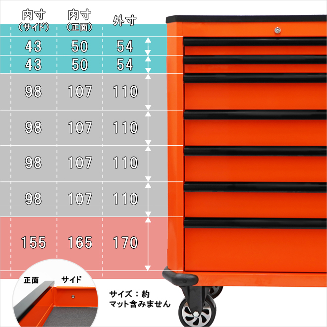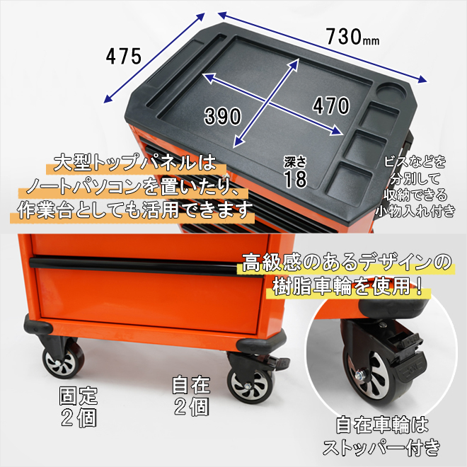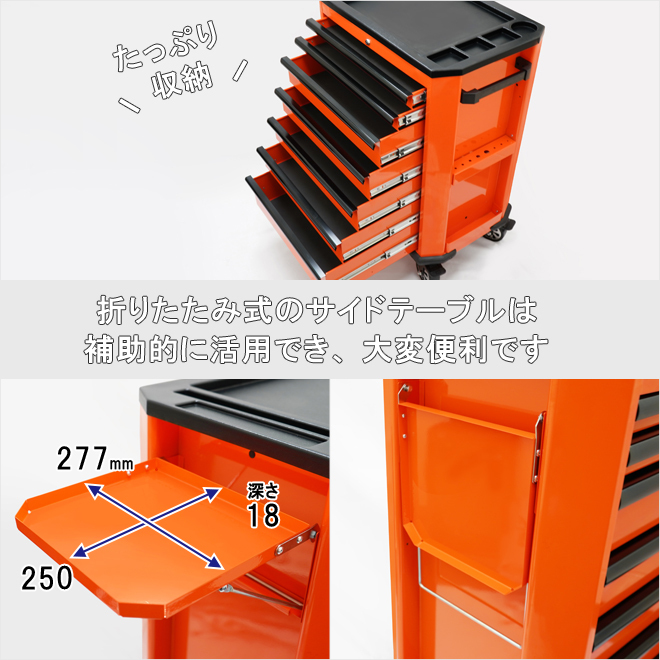 ●収納力・機能性抜群ローラーキャビネット 引き出しは、すべてボールベアリングレールを使用!! キャスターは樹脂(PP)車輪で樹脂床に優しく油にも強い ●収納力&機能性抜群!サイドテーブルが付いたキャビネット7段 メカニックやDIYなど、整備工具や修理道具の整理整頓に ●パウダーコーティング塗装で耐久性の優れた美しい仕上がり ●両サイド下部にはスプレー缶を収納でき、右側サイドはドライバー挿しを装備 折りたたみ式サイドテーブルは必要に応じて補助的に活用でき、大変便利です ●大型トップパネルはノートパソコンを置いたり作業台としても活用できます トップパネルの左右には小物入れを配置し、ビスなどを分別して収納できます ●引き出しは全てベアリングレールを使用し、スムーズに動きます 引き出しを押し込む事で軽くキャッチになり、飛び出し防止になります ●引き出しはキーにより全段ロック可能 引き出し全段に中敷きマットが付いています ●キャスターは大型で高級感のある樹脂車輪 自在キャスター(2個)はストッパーが付いています ●固定車輪2個を別売りの自在キャスター(2個セット)に付け替えて、全て自在車輪にする事が可能です |