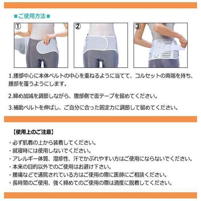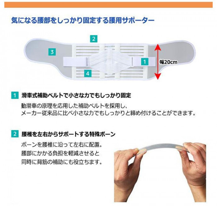 | 動滑車の原理を応用した補助ベルトを使い、メーカー従来品に比べ小さな力でもしっかりと締め付けることができます。特殊ボーンによる左右からのサポートで、腰部にかかる負担を軽減させると同時に背筋の補助にも役立ちます。 |