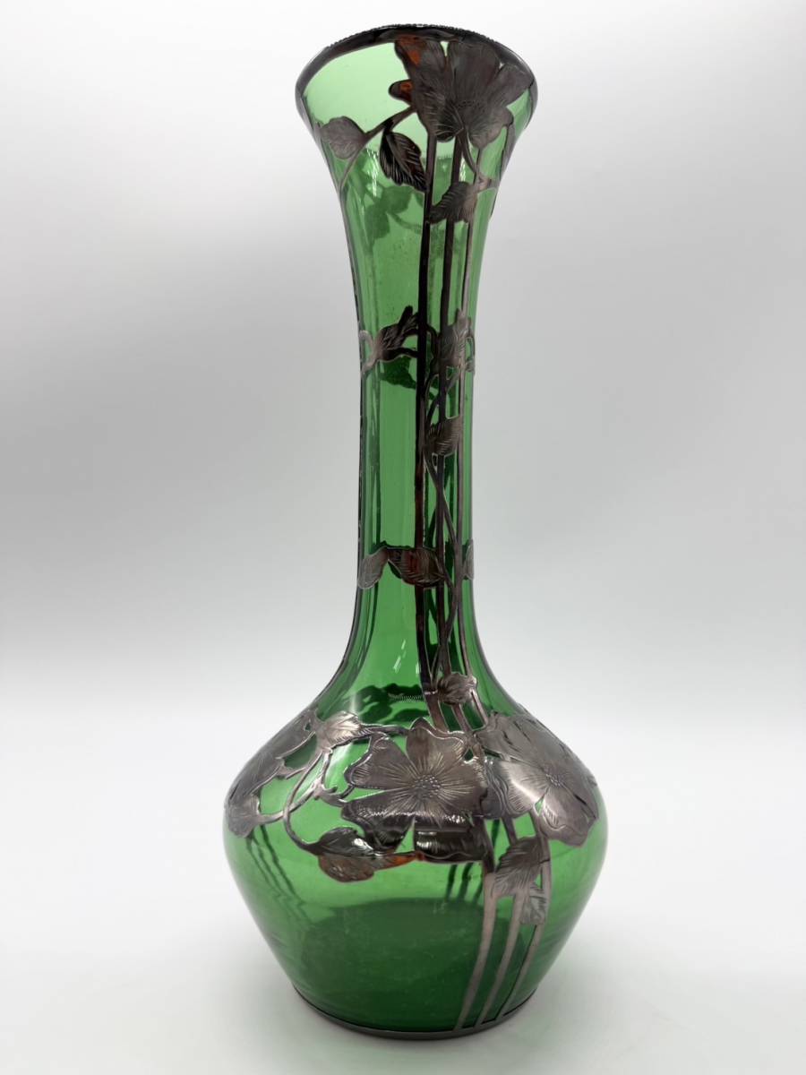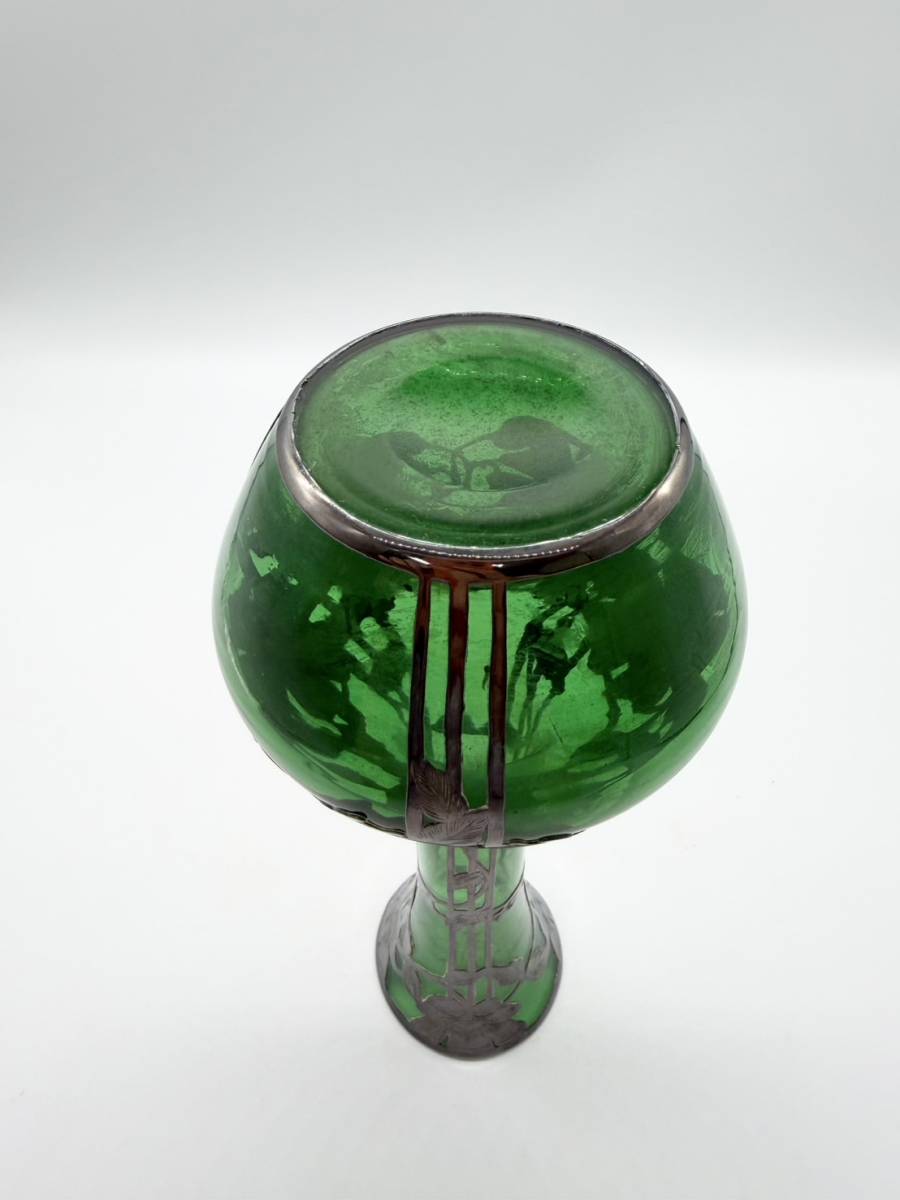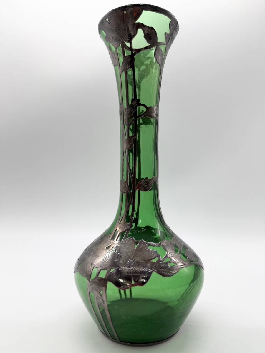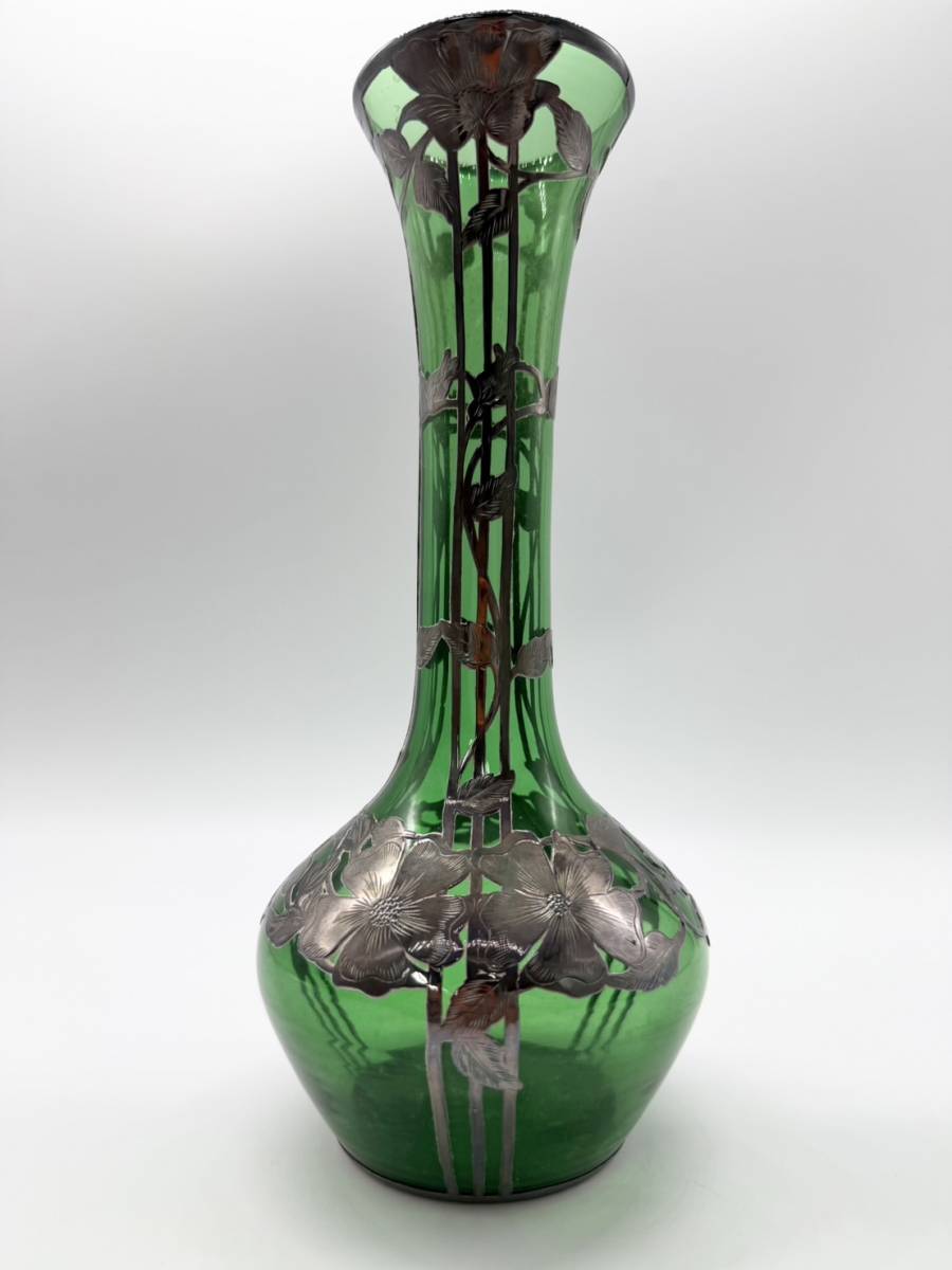 ●シルバー オーバーレイ グリーン アメリカ 銀巻き技法 グラスウェア ガラス 花瓶 フラワーベース アンティーク 高さ25.5センチ