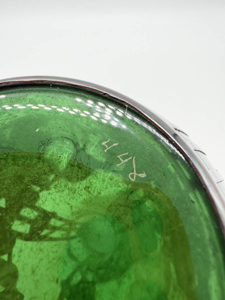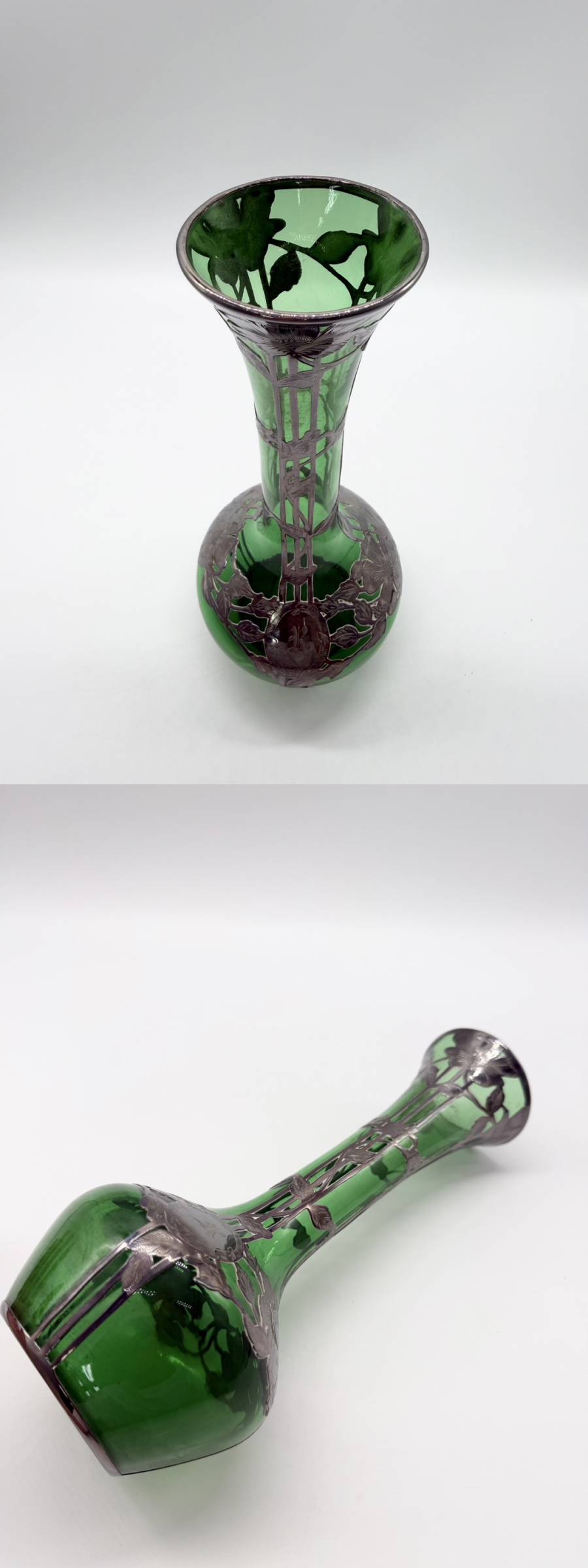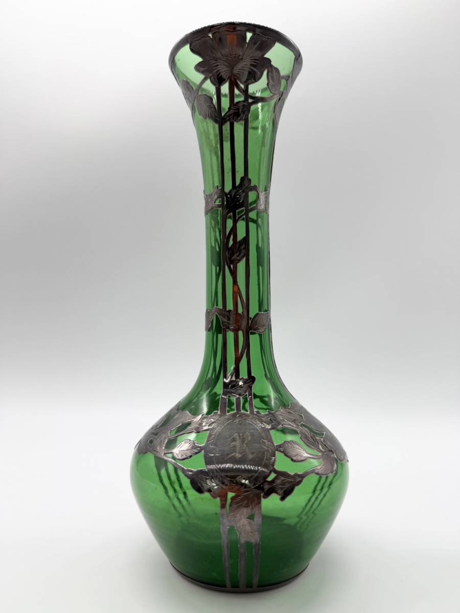 ●シルバー オーバーレイ グリーン アメリカ 銀巻き技法 グラスウェア ガラス 花瓶 フラワーベース アンティーク 高さ25.5センチ