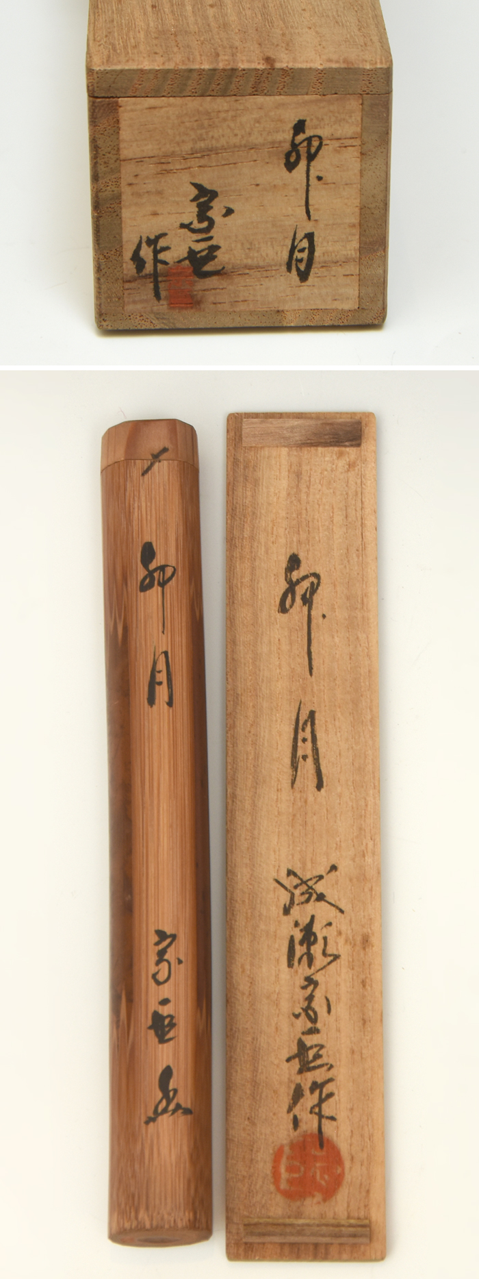 成瀬宗巨(作)茶杓 銘「卯月」です。 節のたっぷりした白錆竹を削り出し杓にしています。 節表から脇、杓裏に根来の塗が施されています。 ※撮影の際に生じた写り込みなどがございます。 ご理解の程よろしくお願い致します。 |