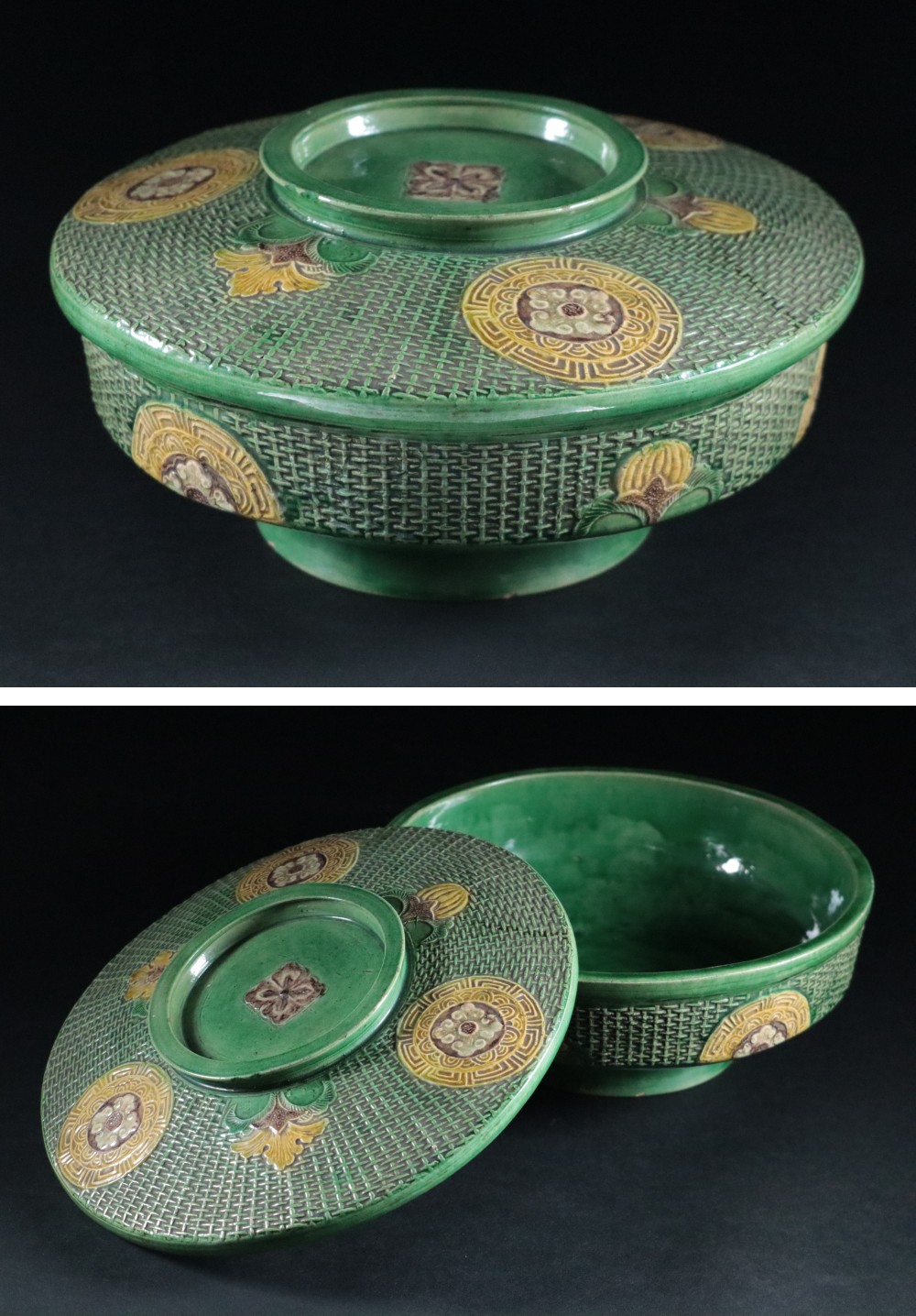 讃岐国 讃岐 源内焼 平賀源内 / 三彩 草花 瓜 竹編籠形 菓子器 菓子鉢 蓋物 / 古陶磁製 時代物 骨董品 古美術品 收藏
