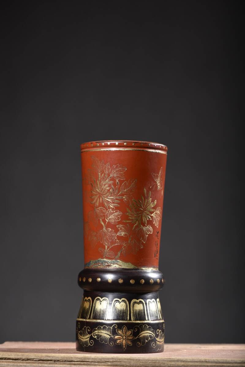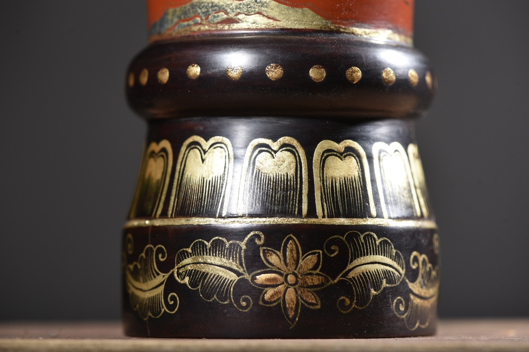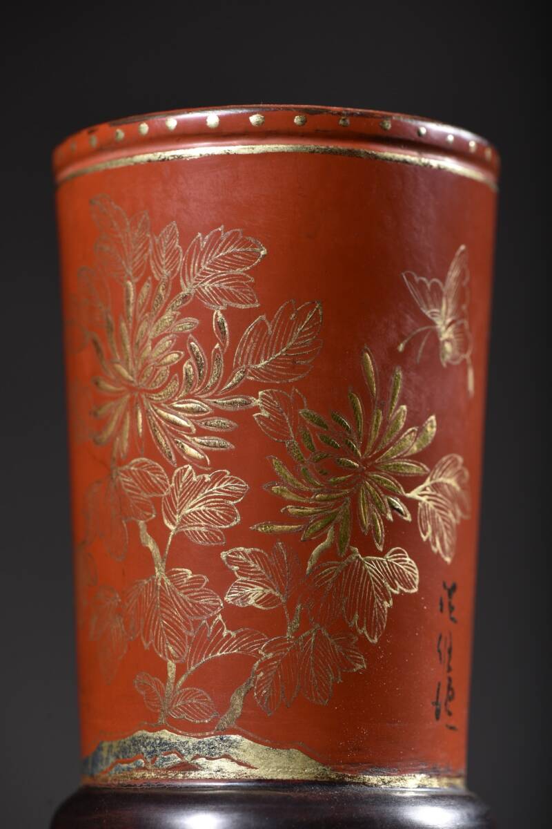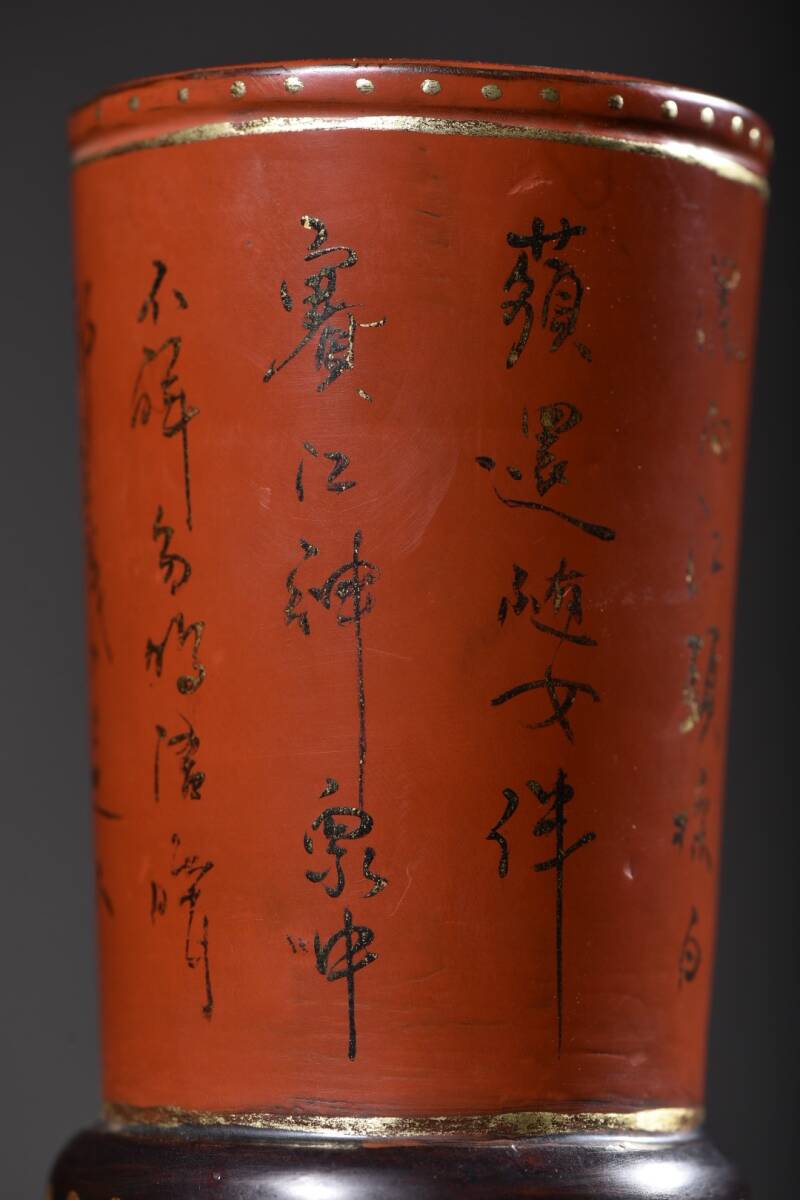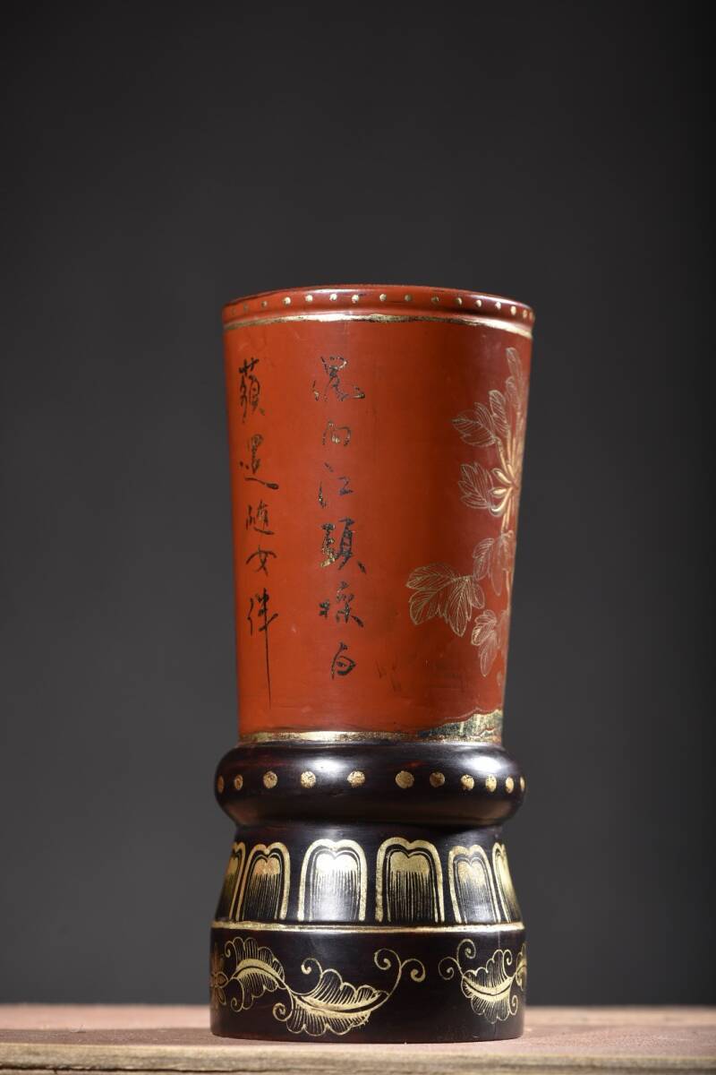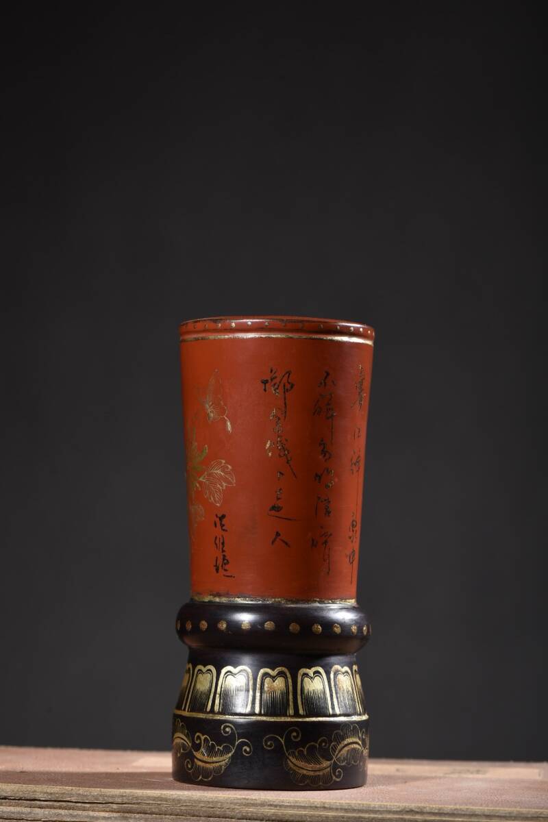 【仁】『木胎漆器彫・描真金・花卉紋・詩詞賦・筆筒・置物・賞物』極細工 古賞物 中国古玩 古美術 古美味 收藏
