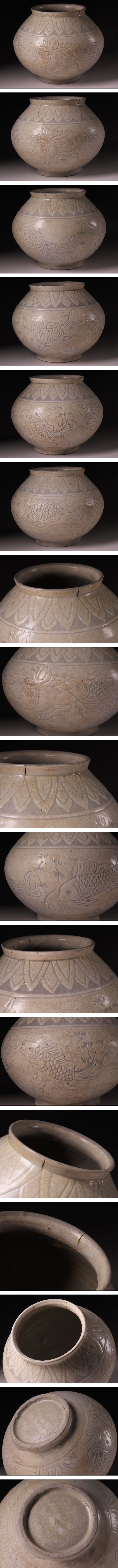 朝鮮美術 朝鮮古陶 李朝 高麗 粉青沙器 掻き落とし 線刻蓮魚文壺 花瓶 梅瓶 高15.9cm 李氏朝鮮 韓国美術 | |||