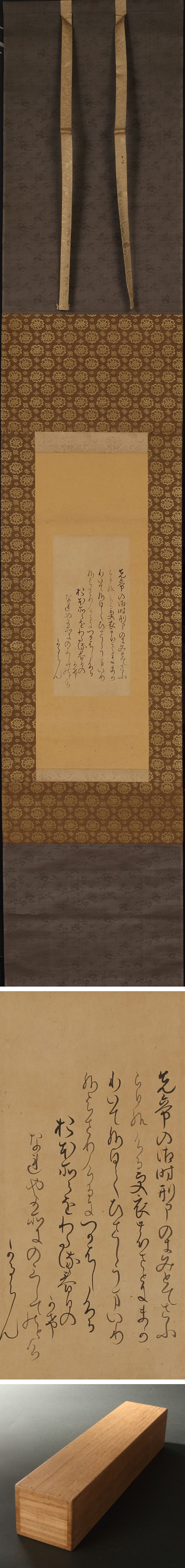 鎌倉期の四半切です。 『大和物語』第四十八段の前半を書写した断簡です。闊達な書風は伝西行「白河切」によく似ており、二条本系統の本文を有することからも、私家集書写を旺盛に行った藤原俊成近縁の書写活動が想定されます。 内容は宇多天皇の治世に「刑部のきみ」として出仕していた女官が、里に帰って久しいために「大空をわたる春日のかげなれや よそにのみしてのどけかるらん」と御製が詠まれたことが認められております。 一見里下がりした更衣を思い遣った、長閑な恋歌に見えますが、宇多帝の刑部卿に源湛(源融長男)がおり、その女に藤原時平室が存することが知られます。源湛が寛平9(897)年刑部卿に昇る一方、時平室が息子藤原顕忠を産んだのが翌昌泰元(898)年であり、宇多帝と時平の間に「刑部のきみ」をめぐる何らかの事態が起こったことを示す章段であったと見られます。「先帝」を清和天皇、「刑部のきみ」を藤原良近女とする説も見受けられますが、寛平9(897)年の宇多帝の突然の譲位、また「かすが」とも読める「春日」の存在もまた、実しやかにこの歌が宇多帝の御製として読まれた一因でしょう。 但し、後見の乏しい、身籠った寵姫を権門の側室とすることで敢えて君臣関係を示し、生まれた子女および母を守る方策のひとつであったとも考えられます。実際、藤原顕忠は後に道真の祟りにより早逝が続いた時平一族のなかでただ一人長命を保っており、日頃の謙抑や天神崇拝のほかに、宇多天皇の落胤とする噂が囁かれても決しておかしくはありません。 王朝文学の受容や王朝人をめぐる考察が愉しい、見事な古筆の逸品です。 〔本文〕 先帝の御時刑部のきみとてさふ らひ給ける更衣のさとにまか りいて給ひてひさしうまいり 給はさりけるにつかはしける おほそらをわたる春日の かけ なれやよそにのみしてのとけ かるらん 付属:時代箱が付属します。 寸法:高さ152cm、幅27cm(最大幅。若干の誤差はご了承下さい) 状態:経年のイタミがございます。 |