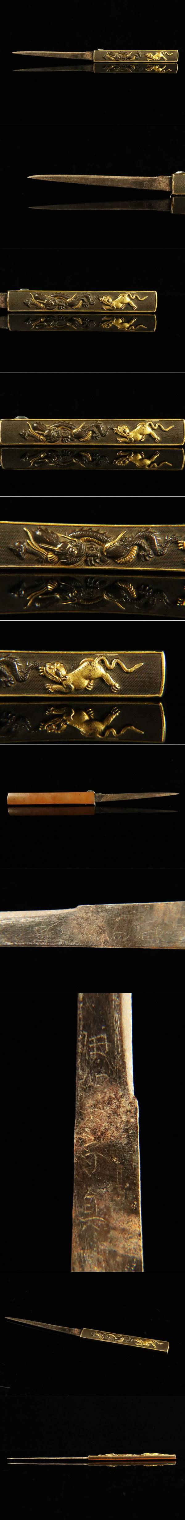 【ASAHI】時代武具 赤銅魚子地竹龍虎図小柄 裏素銅地 小刀 刀装具 小道具[71164ww] 收藏