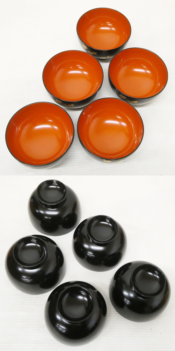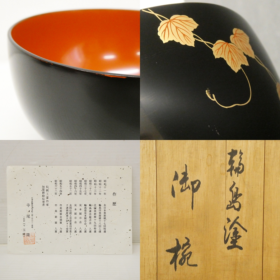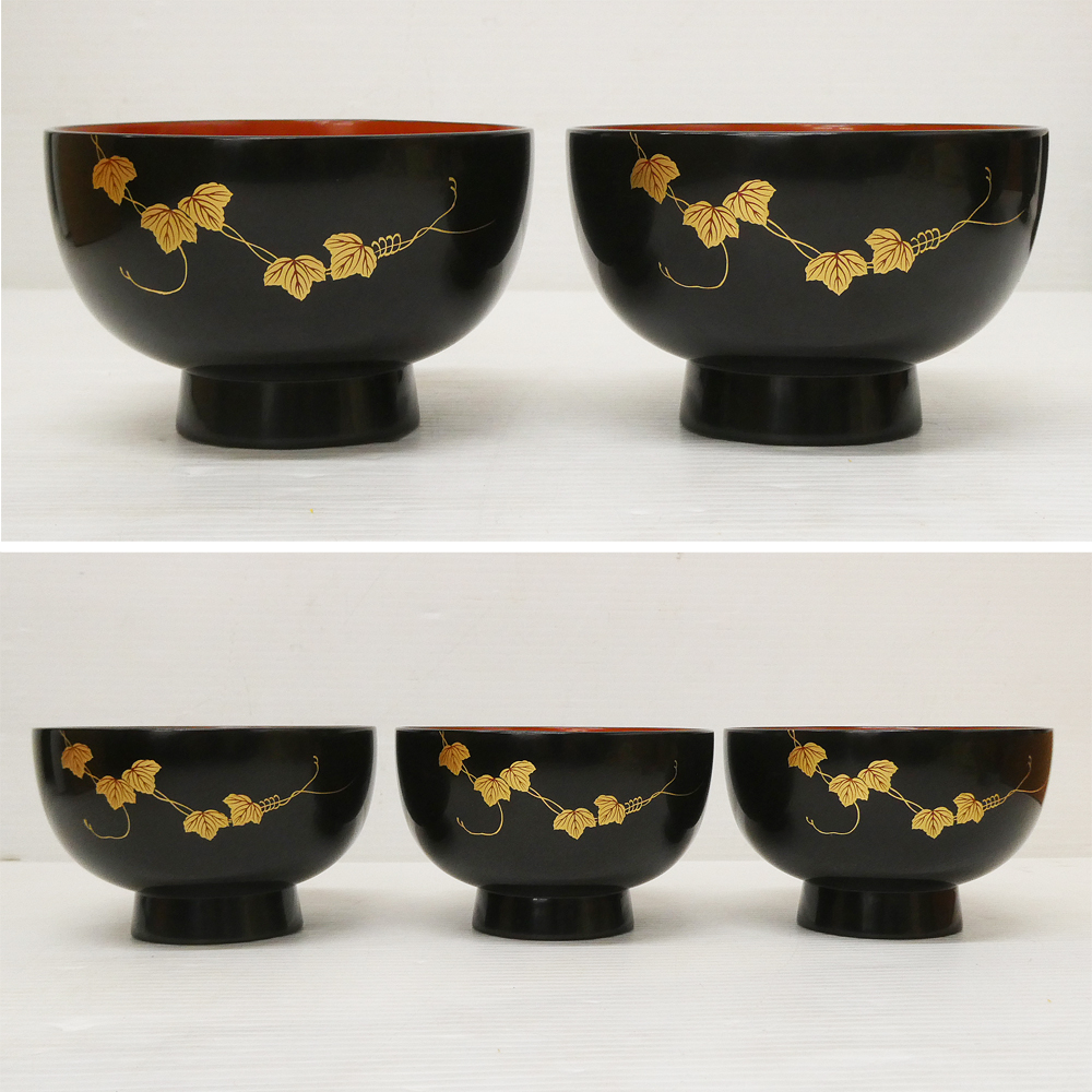 M59) 輪島塗 寺尾隆 二代目 玉峰 作 御椀 5客揃 黒内朱漆塗 蔦蒔絵 共箱付き!! 木製 漆器 黒漆 朱塗 汁椀 五人前 漆器 和食器 懐石道具 ♯ 收藏
