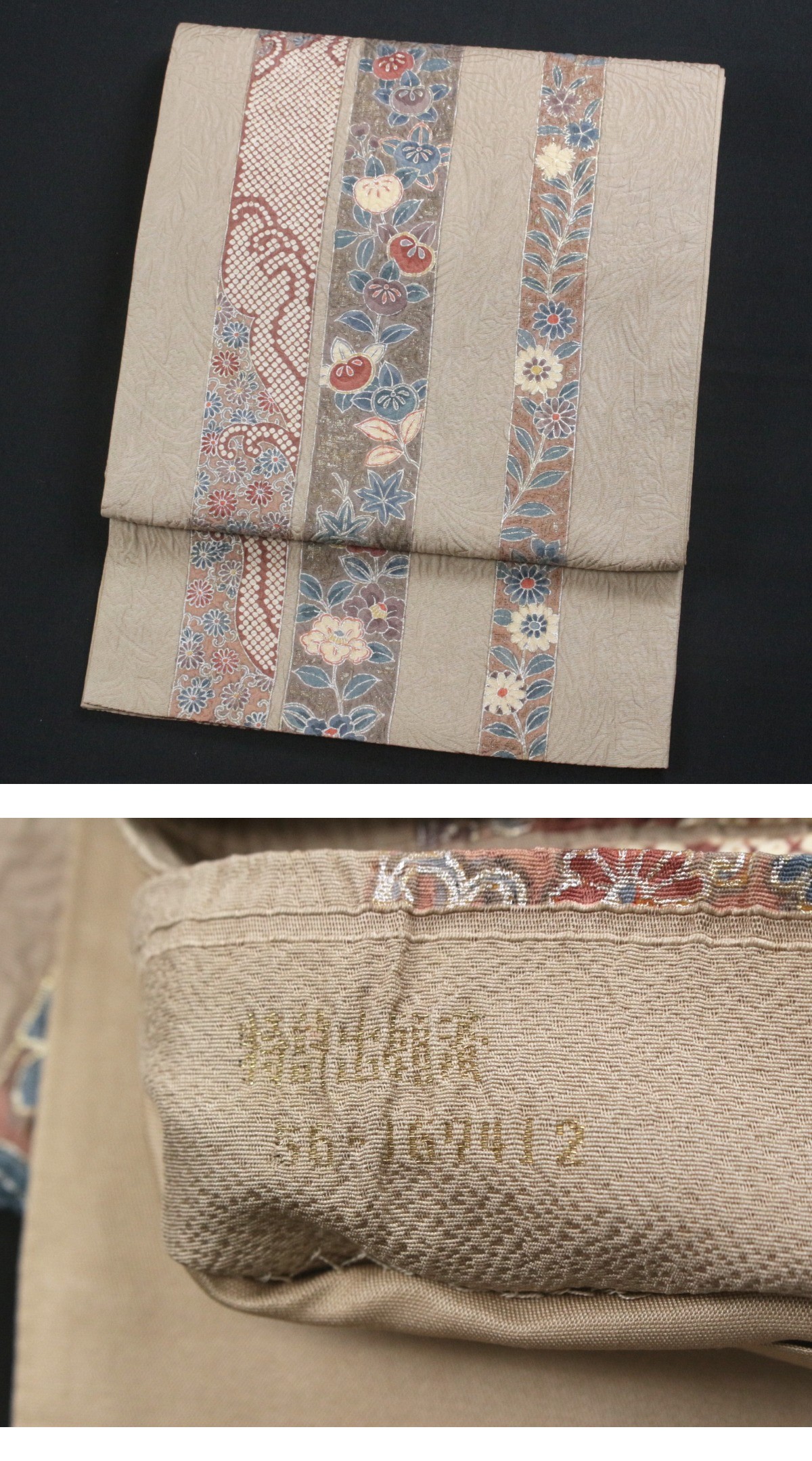 穏やかな地色に、縞文を基調として植物文様を配した、上品で趣深い正絹袋帯のご紹介です。 全体は落ち着いたトーンでまとめられ、縞のリズムの中に草花や実もの、葉文様が丁寧に表現されており、控えめながらも奥行きのある表情をお楽しみいただけます。 本品には「結播(ゆいは)」の意匠が用いられています。 結播とは、人と人、想いと想いを“結び”、そこから新たな美や物語が“播かれる”という意味を込めた、現代的な感性と伝統技法を融合させたものづくりの考え方です。単なる装飾にとどまらず、日常の装いの中で自然に寄り添い、長く愛用できる美を目指して制作されています。 細やかな織りと、柔らかな色調で描かれた植物文様は、見るほどに味わいが増し、主張しすぎない洗練された印象。訪問着や付下げ、色無地はもちろん、小紋などにも合わせやすく、セミフォーマルからお出かけ着まで幅広くお使いいただけます。 流行に左右されにくく、季節を問わず活躍する一条。 結播の思想が息づく、静かな美しさと品格を備えた正絹袋帯としておすすめのお品です。 ※撮影時の部屋の照明によって画像の色に若干の差がございます。色味に差がございますことをご了承のうえご検討下さいませ。 …状態… 締め跡。お太鼓に変色あり。 ※全くの新品ではございませんので、記載のない変色やスレ、ヤケ、その他僅かな難がある場合がございます。そのような理由でのキャンセルはお受けできませんので、ご了承の上ご検討お願いいたします。 |
