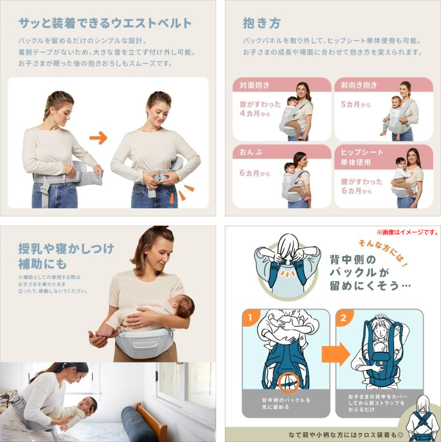 【商品特長】 乗せ降ろしが増えても、ヒップシートで手軽に抱っこ。クッション付きのシートがお子さまを快適な姿勢で支えます。 装着はバックルを留めるだけの簡単仕様。バックパネルを外してシート単体使用も可能です。 ◆人間工学に基づいたシート! 滑り止めとクッション性のあるシートが、お子さまの自然な座り姿勢をサポートします。 ◆サッと装着できるウエストベルト! バックルを留めるだけのシンプルな設計。着脱テープがないため、大きな音を立てず簡単に付け外し可能。 お子さまが眠った後の抱きおろしもスムーズです。 ◆豊富な抱き方! 基本の対面抱きに加え、前向き抱きやおんぶも可能。バックパネルを取り外してヒップシート単体で 使用することもできるため、お子さまの成長や使用場面に合わせて使い分けができます。 ◆あると嬉しい機能がたくさん! バックパネルには日よけフードを内蔵。定番モデルの「OMNI Breeze(オムニブリーズ)」でもご好評いただいている、 大容量のポケットや反射テープなど、パパママに嬉しい機能も搭載されています。 | |||||||||||||||||||||||