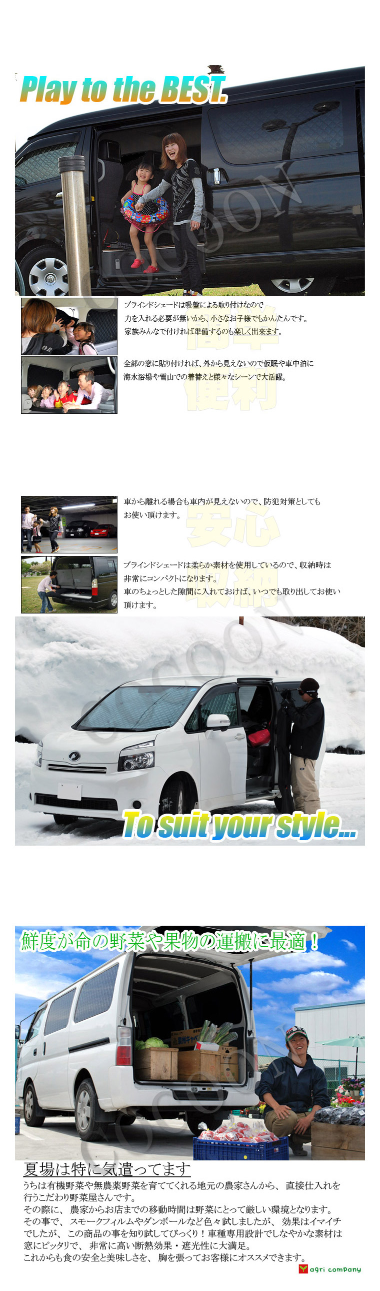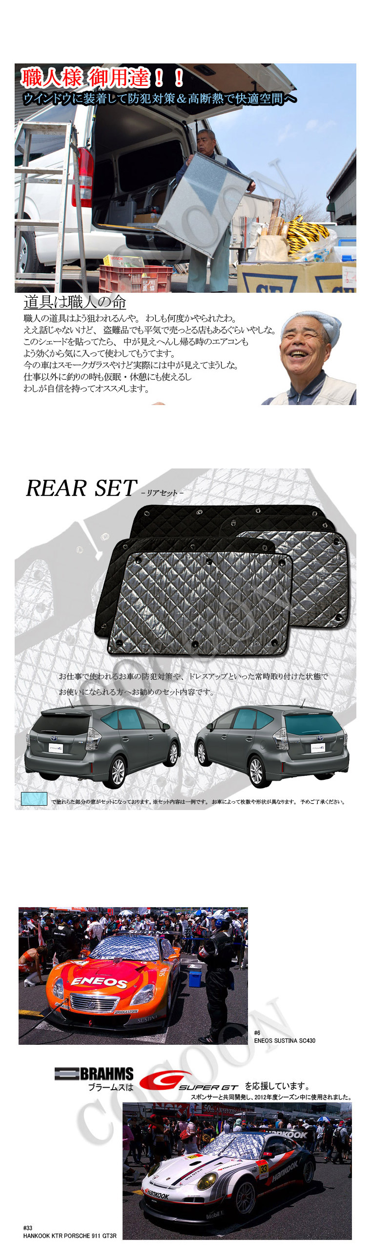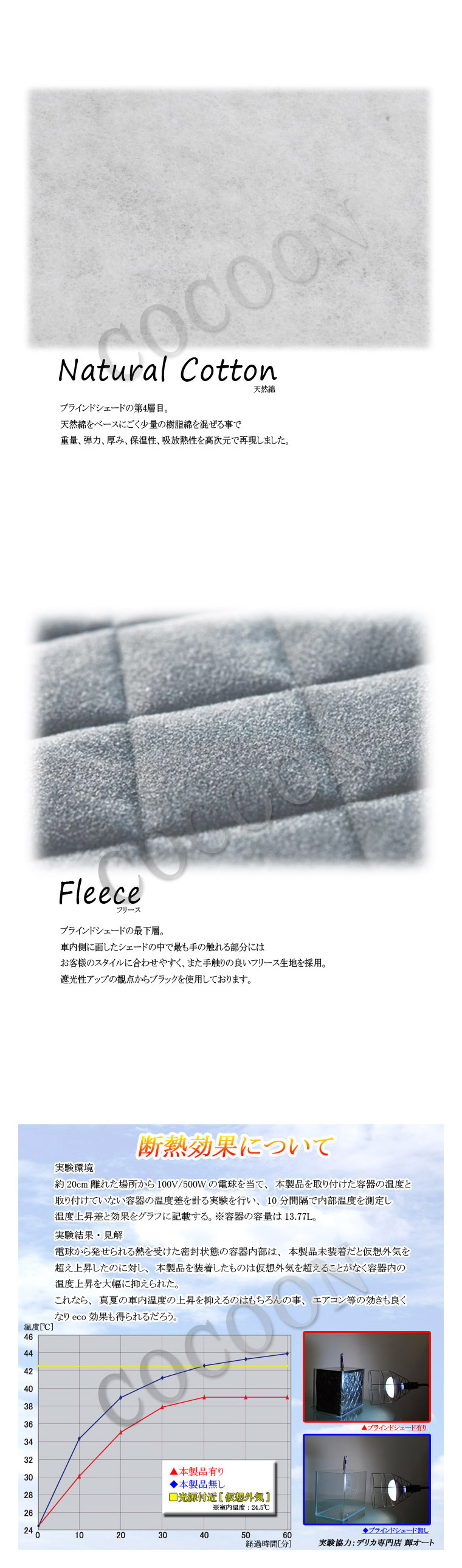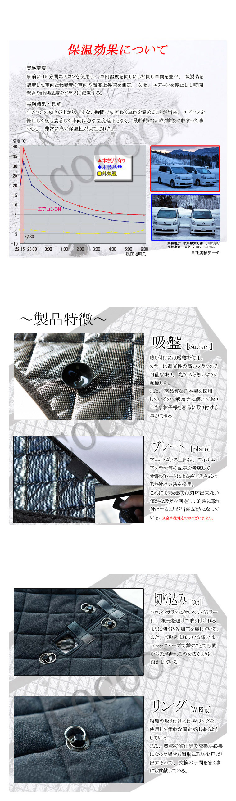 | 製品に関する 注意事項 | 本製品は外気温の影響を和らげるように設計、製造しておりますが、車内にお子様やペットを乗せたままお車から離れないで下さい。 走行中のご使用は大変危険です。お車を動かされる前に取り外すようにして下さい。 本製品はその構造上、中綿が縮んだり、黒ハトメが劣化したりする恐れがある為水洗い出来ません。 洗う必要があった場合、ドライクリーニング程度にとどめタンブラー乾燥は避けてく下さい。 吸盤を強く引っ張らないで下さい。勢いよく外すと破損したり、怪我の要因になります。 本製品は全ての車犯罪に対して効果を発揮するものではありません。 |
