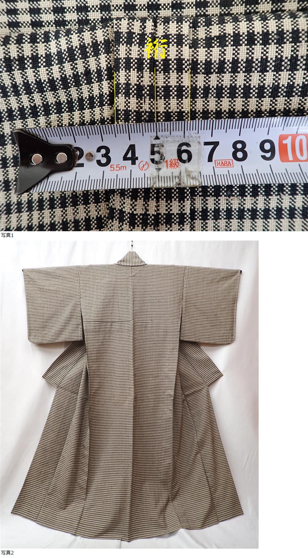 秀品 大人のモダン ウールのお着物 身丈157.5cm(+5.5cm) 裄丈67.5cm ギンガムチェック 八掛正絹 カジュアル着 | ||||