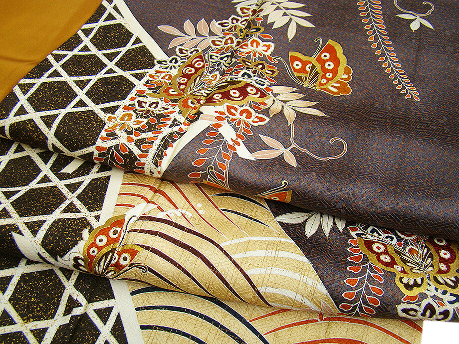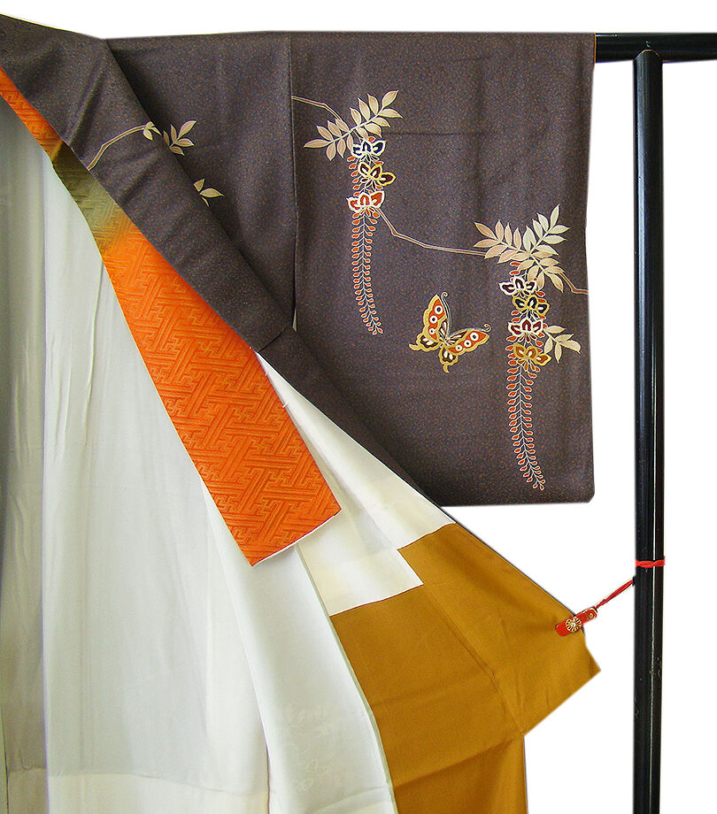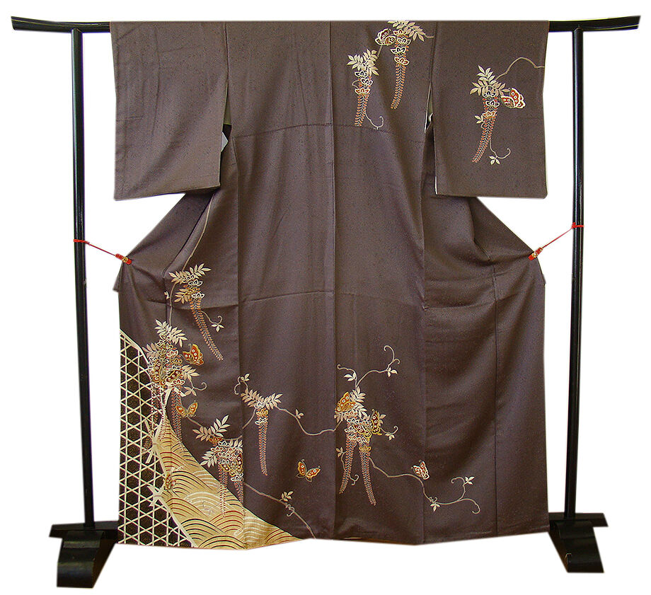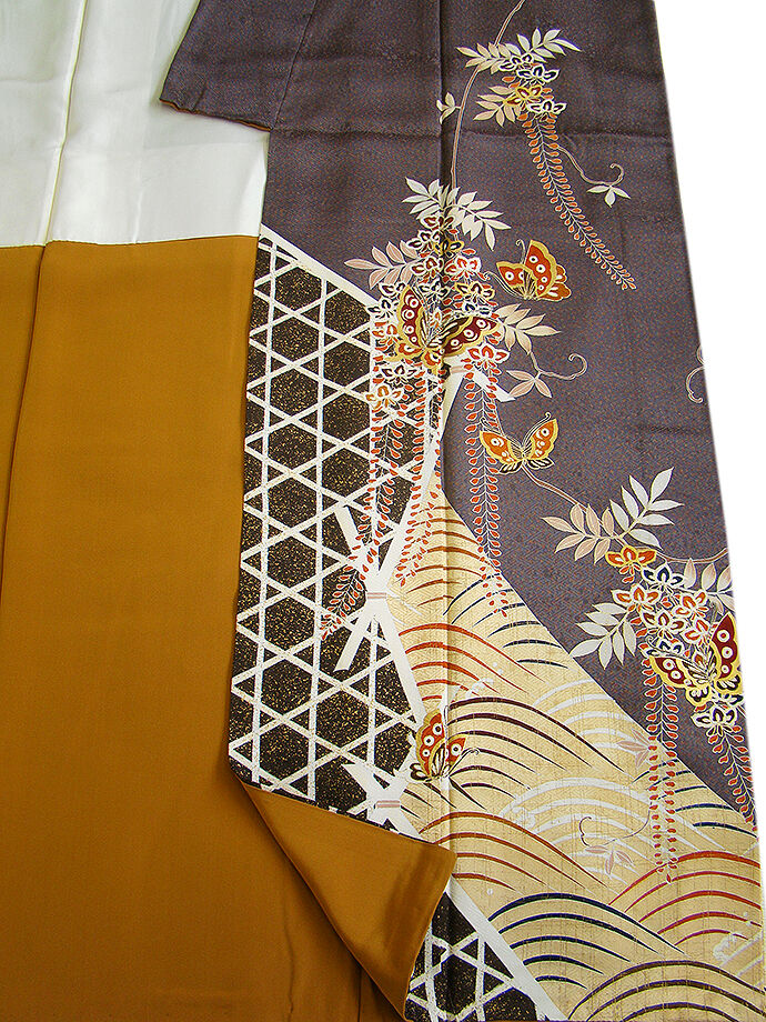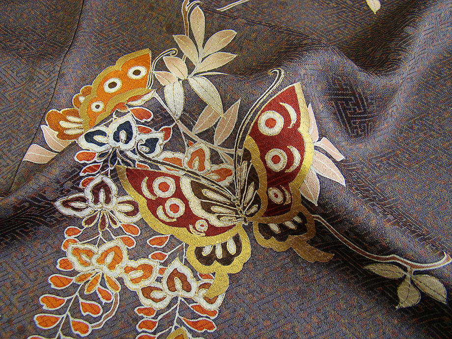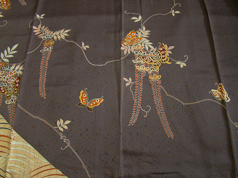 | 商品説明 | こちらのお品は「袷」ですので10月から5月までお召頂ければと思います。 しなやかでんさらりとした滑らかな手触りの着心地良い重めの紋意匠の生地、 渋い紫鼠色地に国防、赤茶色の染柄に地模様入りに、蝶々、波、花草柄の染柄に金彩加工仕立て、 八掛は駱駝色(正絹)、重ね衿付き、幅広い年代の方にお召頂けます。 |