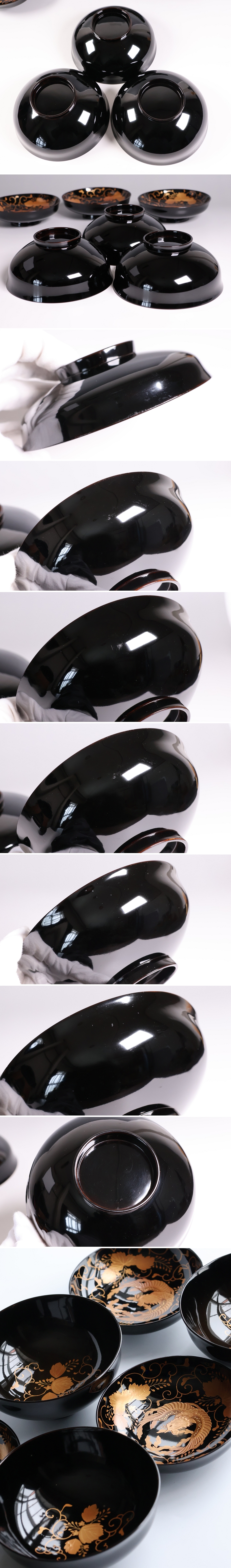 【MB194】天然木漆塗 鳳凰桐唐草 金蒔絵 黒塗 吸物椀 三客 大正昭和 / (検) 輪島 加賀 京都 木製漆器 漆芸 茶懐石 伝統工芸品 收藏