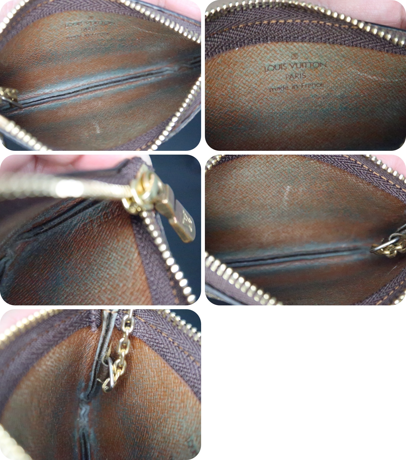 | <外側> | ファスナーを私が交換しております。引手は純正です。 ファスナー脇のモノグラム生地に微細なひび割れが見られます。 |