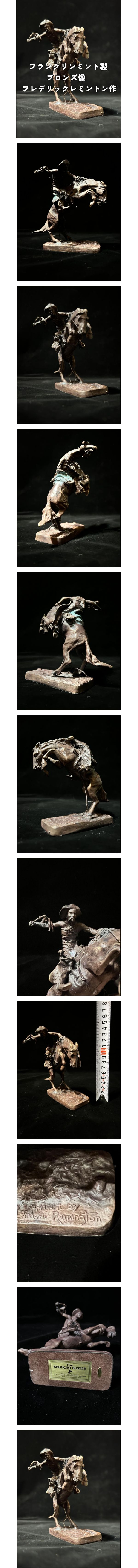 | 商品説明 | フランクリンミント製 ブロンズ像 [The BRONCHO BUSTER] フレデリック・レミントン作、在銘銅像の出品です。 馬、人、まさしく人馬一体の躍動する作品です。 馬の背、鞍回りに緑青が出ています。 画像にてよくご確認下さい。 サイズ 約15cm 重量 1332g 【画像無断転載、転売について】 弊社は海外へ直接出品しています。 弊社出品物を海外サイトへ無断画像盗用にて販売されている事を 発見した場合、即座にVero通報及び法的訴訟の対応及び即時出品物を購入、 当出品を取り下げいたします。 無断転載、転売は絶対に許しません。 ・品物に年式が記されている物以外の制作年月はあくまで当方の主観、または入手時に前所有者より聞き及んだ年代です。参考値としてご理解下さい。 ・1円、1000円などの低額スタートにて想定より大幅に金額が到達しない場合や また記載項目と実際の品に乖離があった場合を出品取り下げる場合がございます。 入札後の取り下げは出品者の権利として上で認められております。 当出品は営利で運営しており不用品等の譲渡ではない為、ご理解の程お願い致します。 その場合、定額にて再出品させて頂きますが、初回の1000円スタートでの落札価格が最も安価に入手できる機会となる為、初回の定額スタートにて入札をお勧めいたします。 |