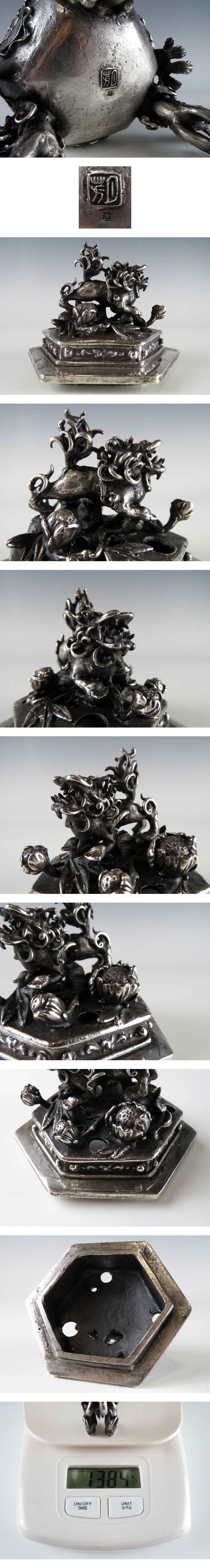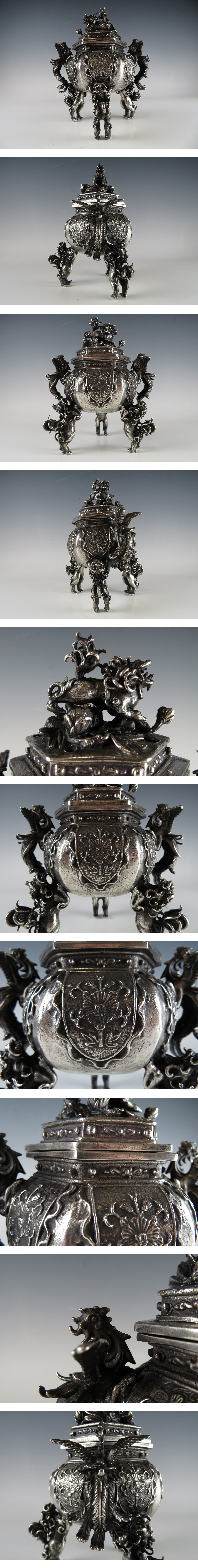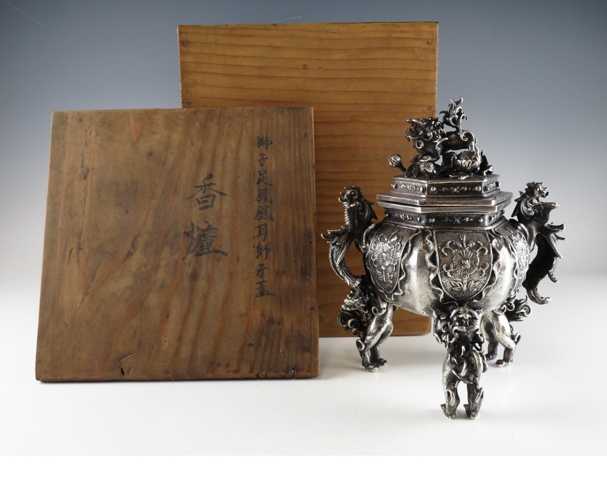 ☆ 仏教美術 銀刻印 須賀 月芳 高肉 鳳凰耳付 獅子:摘み 三足 香炉 約 1.3 kg になります。 ※ 素材については銀の刻印は御座いますが、鑑定を行っていない為に純度は不明です。メッキ等あらゆる可能性を考慮の上、ご納得頂きオークションご参加下さい。