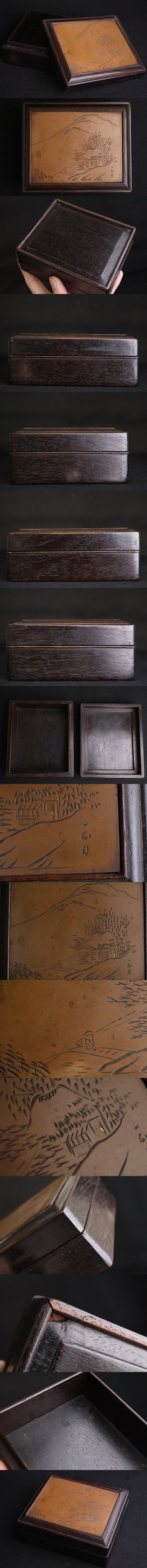TB526金属の彫金装飾 木箱 蓋物◇約4.6×12×10cm/在銘/木製/小箱/香箱/文箱/硯箱/山水/彫物/木工芸/時代/骨董/古美術/古道具タグボート 收藏
