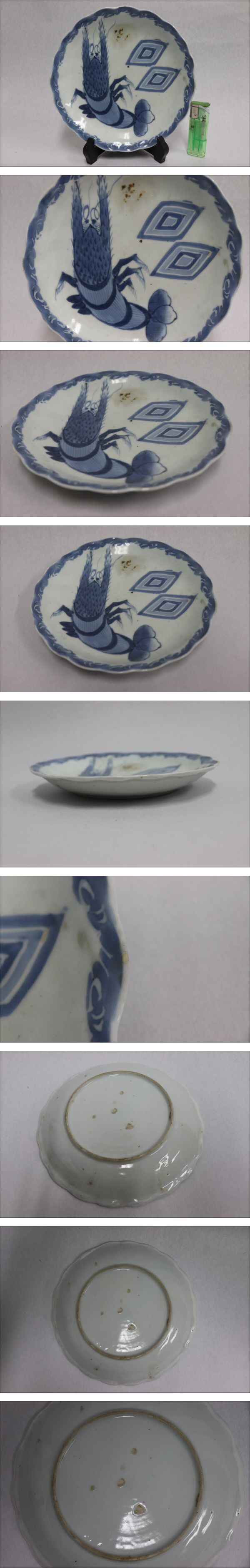 | 商品説明 | 商品名 江戸中期 古伊万里 染付 伊勢海老文 輪花 七寸皿 付属品:なし。 サイズ:高さ2.7cm、口径20.3cm、底径12.3cm。 状態: 一箇所ノミホツの直しがございますが、その他は良好です。 |