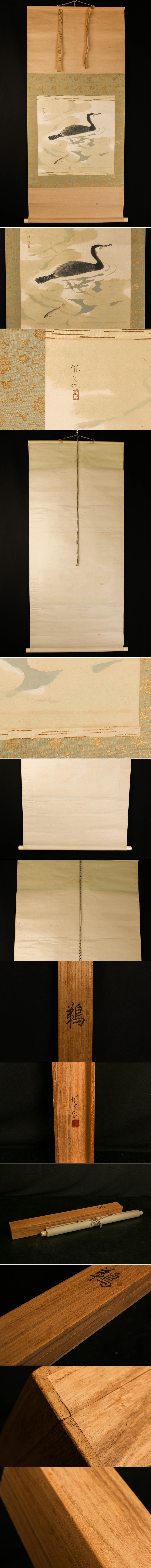 【SAG】松久休光 『鵜』日本画 紙本 肉筆 落款 掛軸 共箱 本物保証 收藏