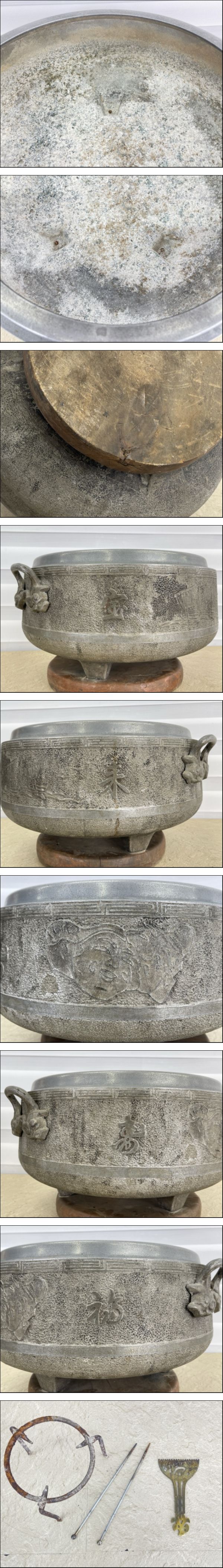 *タイトルの末尾は管理番号となります。 サイズ(幅/奥行き/高さ): 約 49.5/43/28 cm ※突起部と台座含む 重量: 約5.3kg ※素人寸法です。若干の誤差はご了承下さい。 金属の素材がわかりません。 磁石はくっつきませんでした。 カテゴリーもあっているかわかりません。 画像にて判断をお願い致します。 コメント 中古品です。 使用に伴うスレ傷があります。 全体的にくすみや黒ずみや汚れがあり、ネジにさびがあります。 内部には白や茶色の汚れが残っています。 火鉢の底の真ん中が破損しているのか元々の仕様なのか穴がいてるように見えますが台座がくっついているので確認が出来ません。 木製台座がくっついてますが劣化して変形やヒビ割れしています。 付属しているのものが全て関係しているのかはわかりません。 商品は写真にあるもので全てです。 必ず写真で確認お願い致します。 他にもたくさん出品しています。 同一梱包致しますのでよろしくお願いします。 ※ジャンク品の商品は、故障や破損、欠品、動作未確認、 正常な動作のお約束ができない等、 様々な理由にてジャンク品として販売をさせて頂いております。 その為、商品の返品・返金・交換等の 対応は出来ません。 修理、パーツ取りなどを想定しお買い求め下さい。 ※保証について 動作保証と記載のある商品については、商品に不具合が生じた場合、 商品到着後8日以内は返品、返金をお受けいたします。 取付や工事が必要なものに関しましては、 それに必要な費用は当方では負担致しません。 取付費、工事費は保証対象外となります。 当方で販売いたしました商品が明確な原因で重大な事故へと発展いたしました 場合にも、商品代金の2倍以上の責任は負いかねます。 商品を利用される際には、必ず状態をご確認ください。 |