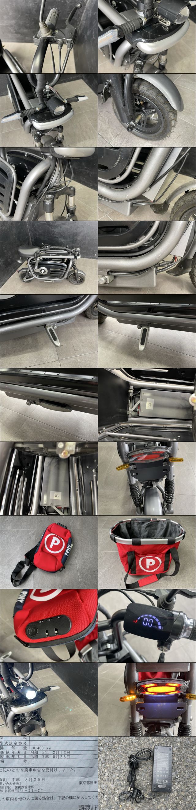 *タイトルの末尾は管理番号となります。 詳細 本商品は公道走行可能な第1種原動機付自転車です。 保安基準に適合しており、ナンバー登録・自賠責保険加入で公道走行可能です。 原動機付自転車の免許を持っていない方への販売は致しません。 また、バッテリーはPSEマークが無い為付属しておりません。 最高速度: 約30km/h 定格出力: 400W 保安部品: ヘッドライト、ウィンカー、テールランプ、ミラー完備 書類: 販売証明書をお付けします。 ご使用の際は、運転免許(原付免許等)、ヘルメットの着用、ナンバー登録、自賠責保険加入が必須です。 状態 状態ランク C 少しキズ、汚れがある