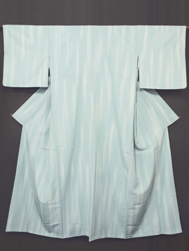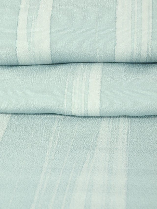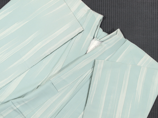 瓶覗(かめのぞき)色の地に、かすれ縞の文様が染められている、縮緬の小紋です。袷仕立てです。 アイスカラーの落ち着いたさわやかさの感じられるお色目に透明感が感じられます。ややシャリ感のある縮緬地です。 しつけ付きの仕立て上がり未使用保管品です。右後身ごろ腰下に直径約 0.5mm の織キズが 1 か所ありますが、まず判別はつきません。淡いお色目のためこまかなくすみなどはあるかもしれませんが、そのほかに目につくしみやよごれ、褪色などのダメージはなく、全体的にきれいな状態です。 |