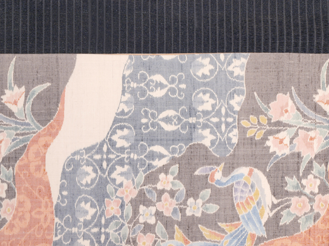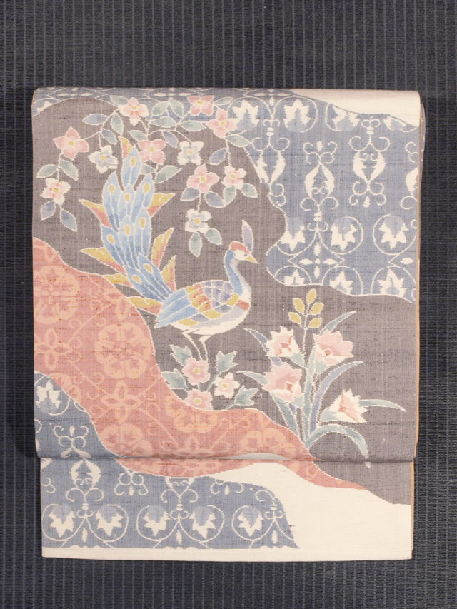 ややきなり色がかった白色の地に道長取りの唐花草と、鳳凰(ほうおう)の文様が織り込まれている、紬の洒落袋帯です。裏面は、淡い江戸茶色の地に褐返(かちかえし)色のたて縞の文様が織り込まれています。 優美な華やぎと品の良いかわいらしさが感じられるお色目で、絣で織りあらわされたのびやかな唐草と気高さのある鳳凰におだやかな美しさが感じられます。裏面はモダンでシックなお色目の粋な縞柄です。全通の豪奢な織りです。 ユーズド品で、前の折り跡がごくうっすらとありますが、あまり使用感は感じられません。目につくしみやよごれ、褪色などのダメージはなく、とてもきれいな状態です。 |