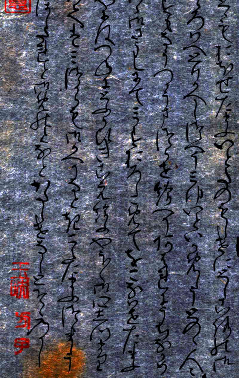 自筆の稀少価値は、和紙の生成技法の緻密さにあります。上の「拡大断層(MRI)写真」でわかる通り、極めて薄い和紙の上に墨の文字がくっきりと浮き上がるように「源氏物語」の文字が記されております。 出品している書の「断層(MRI)写真」の原板は、レントゲン写真と同じ新聞の半分ほどの大きさのフィルムです。肉眼では見ることのできない和紙の繊維の一本一本のミクロの世界を見ることができます。日本国内では医療用以外には見ることのできない書の「断層(MRI)写真」です。 古切の書は、一旦表装を剥離し分析と鑑定検査のために「断層(MRI)写真撮影」をしております。撮影後、展示のために再表装をしております。掛軸や屏風にすることが可能なように、「Removable Paste(再剥離用糊)」を使用しているため、自筆の書に影響をあたえずに、容易に「剥離」することができるような特殊な表装となっております。 |
