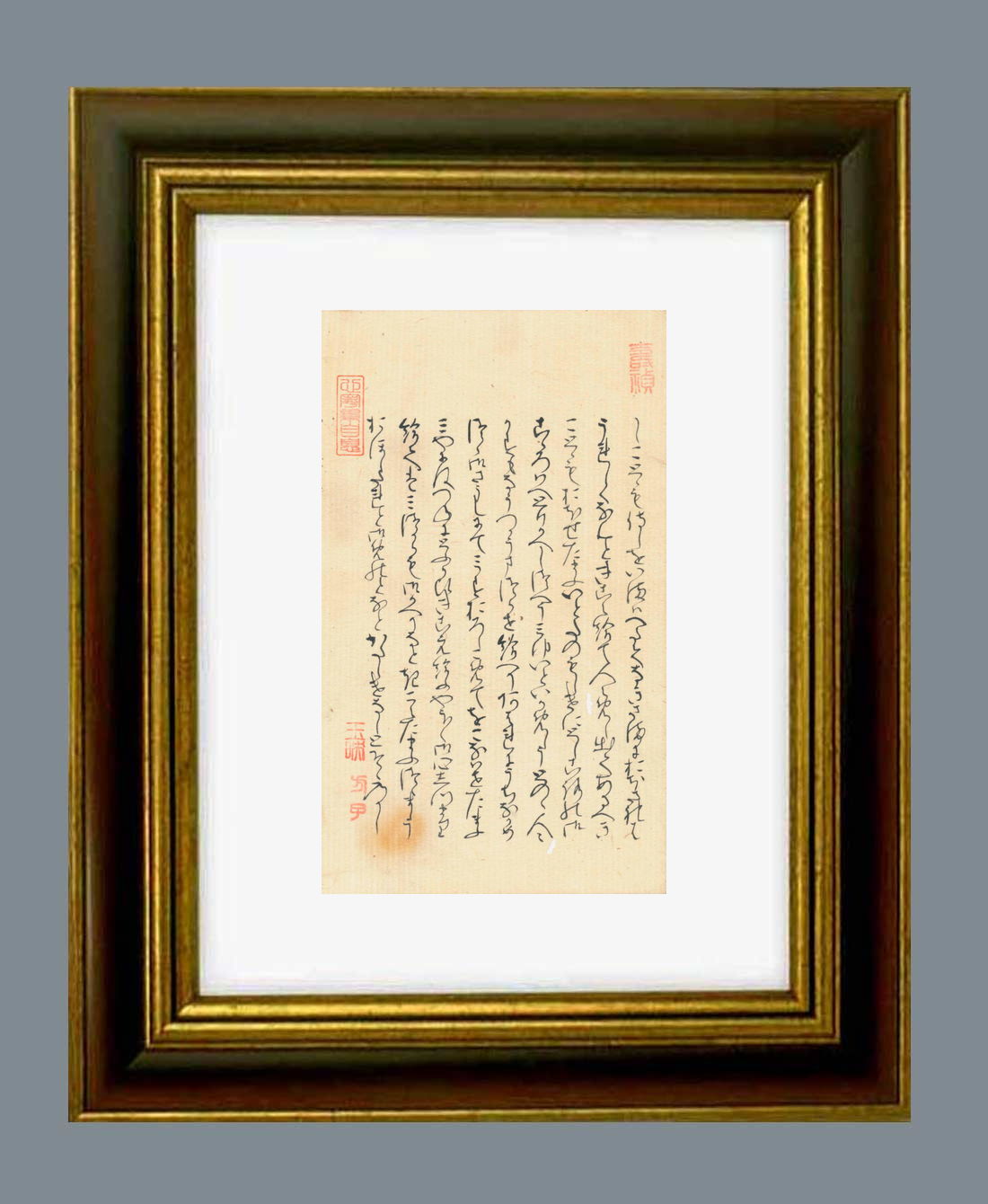 「源氏物語」自筆の大きさ タテ21.8センチ ヨコ12.8センチ。額縁の大きさは タテ37.0センチ ヨコ28.0センチです。額縁は新品です。 |