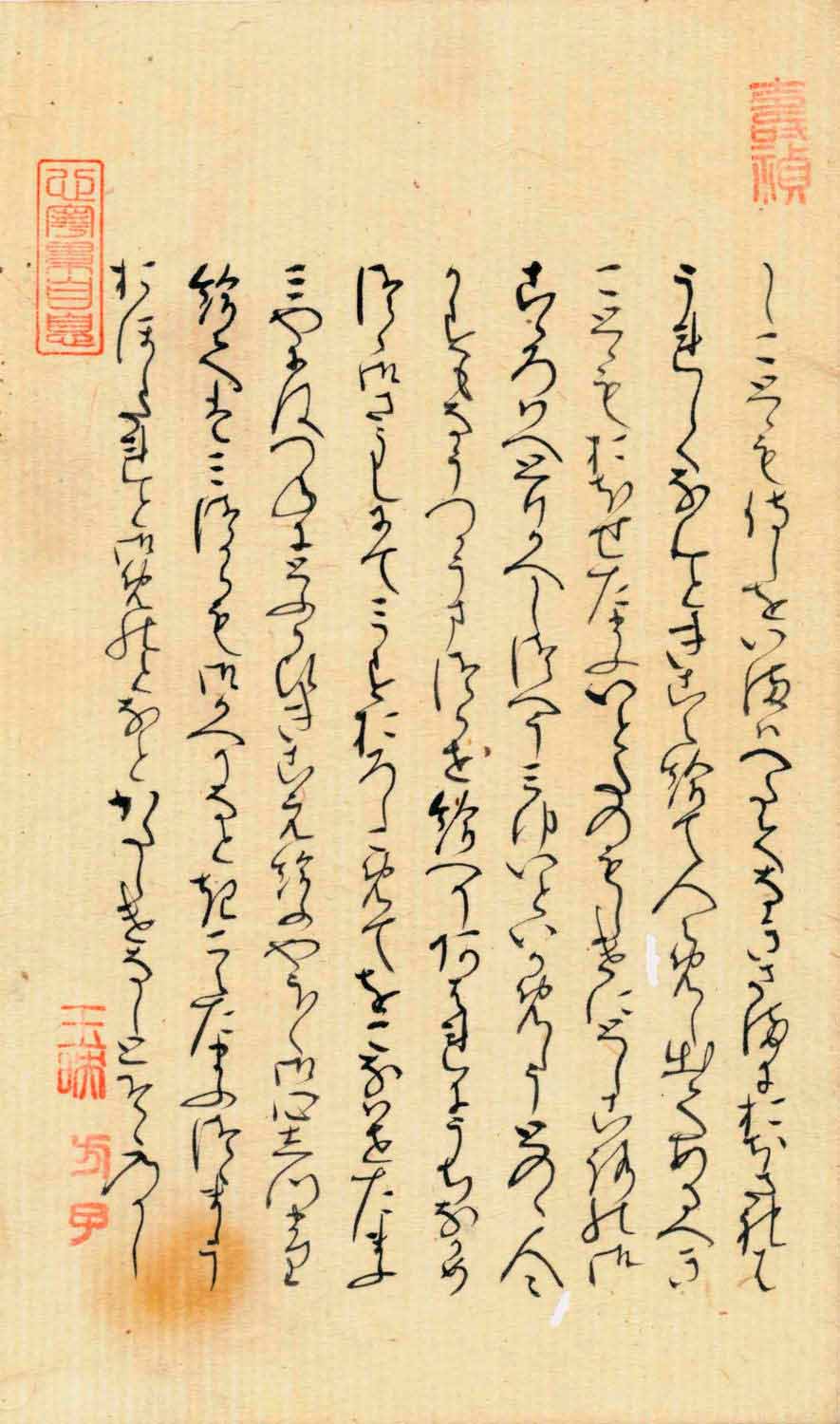 原文上部には「心寧累自息」《心寧(やす)ければ累(るい)も自(おのずか)ら息(や)む》という漢文の篆書印が押捺されている。言葉の意味は、「心安らかならば煩(わずら)いも自然に消える」である。