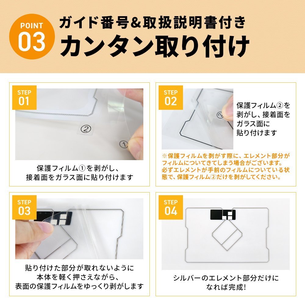 ![]() ■GPS一体型フィルムアンテナ 純正GPS一体型フィルムアンテナ端子に取り付け可能な汎用型アンテナです。 アンテナに手順番号記載で取り付けは簡単です。 端子部の形状が一致し、上から貼り付けるタイプの形状であればお使いいただけます。 お車のお乗り換え、カーナビの買い替え、載せ替え、ガラスの交換時、 中古ナビ購入時などの修理補修用にも 純正同様の受信感度(当社測定) ※受信感度は測定地域により異なります。 ■付属品 ・GPS一体型フィルムアンテナ本体 ・端子部貼り付け両面テープ ・簡易説明書 ※本体は剥離貼り付け後、エレメント部分のみが残るタイプです。 ■注意事項 ※汎用品ですので純正品とフィルム形状は異なります。 ※ワンセグの機種をフルセグにすることはできません。 ※電波の受信感度を保証するものではございません。 ※この商品はフィルムのみとなります。アンプコードなどは付属しておりません。 ※元々受信感度のよくないチューナーの感度性能を良くするといった商品ではございません。 ※天候や場所により受信感度が悪くなる場合がありますが、異常ではございません。 ※電波を通しにくいガラスやフィルムを張り付けたガラスでは受信感度が低下する場合があります。 ※取り付けに自信のない方はカーショップや専門店などに取り付けをご依頼することをお勧めします。 ※取付ミスによる商品の保証対応はしておりませんのでご注意ください。 ■当店取り扱いのフィルムアンテナに関しまして 当店のフィルムアンテナは汎用品の為、多くの機種にお使いいただけますが、 挟み込むタイプにはご使用いただけませんのでご注意ください。