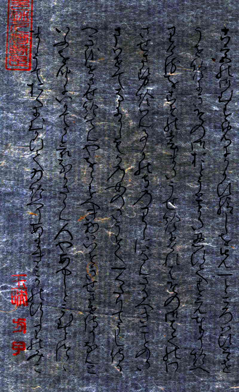 自筆の稀少価値は、和紙の生成技法の緻密さにあります。上の「拡大断層(MRI)写真」でわかる通り、極めて薄い和紙の上に墨の文字がくっきりと浮き上がるように「源氏物語」の文字が記されております。 出品している書の「断層(MRI)写真」の原板は、レントゲン写真と同じ新聞の半分ほどの大きさのフィルムです。肉眼では見ることのできない和紙の繊維の一本一本のミクロの世界を見ることができます。日本国内では医療用以外には見ることのできない書の「断層(MRI)写真」です。 古切の書は、一旦表装を剥離し分析と鑑定検査のために「断層(MRI)写真撮影」をしております。撮影後、展示のために再表装をしております。掛軸や屏風にすることが可能なように、「Removable Paste(再剥離用糊)」を使用しているため、自筆の書に影響をあたえずに、容易に「剥離」することができるような特殊な表装となっております。 |
