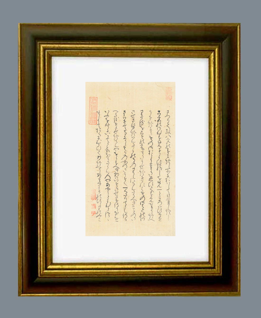 「源氏物語」自筆の大きさ タテ21.8センチ ヨコ12.8センチ。額縁の大きさは タテ37.0センチ ヨコ28.0センチです。額縁は新品です。 |