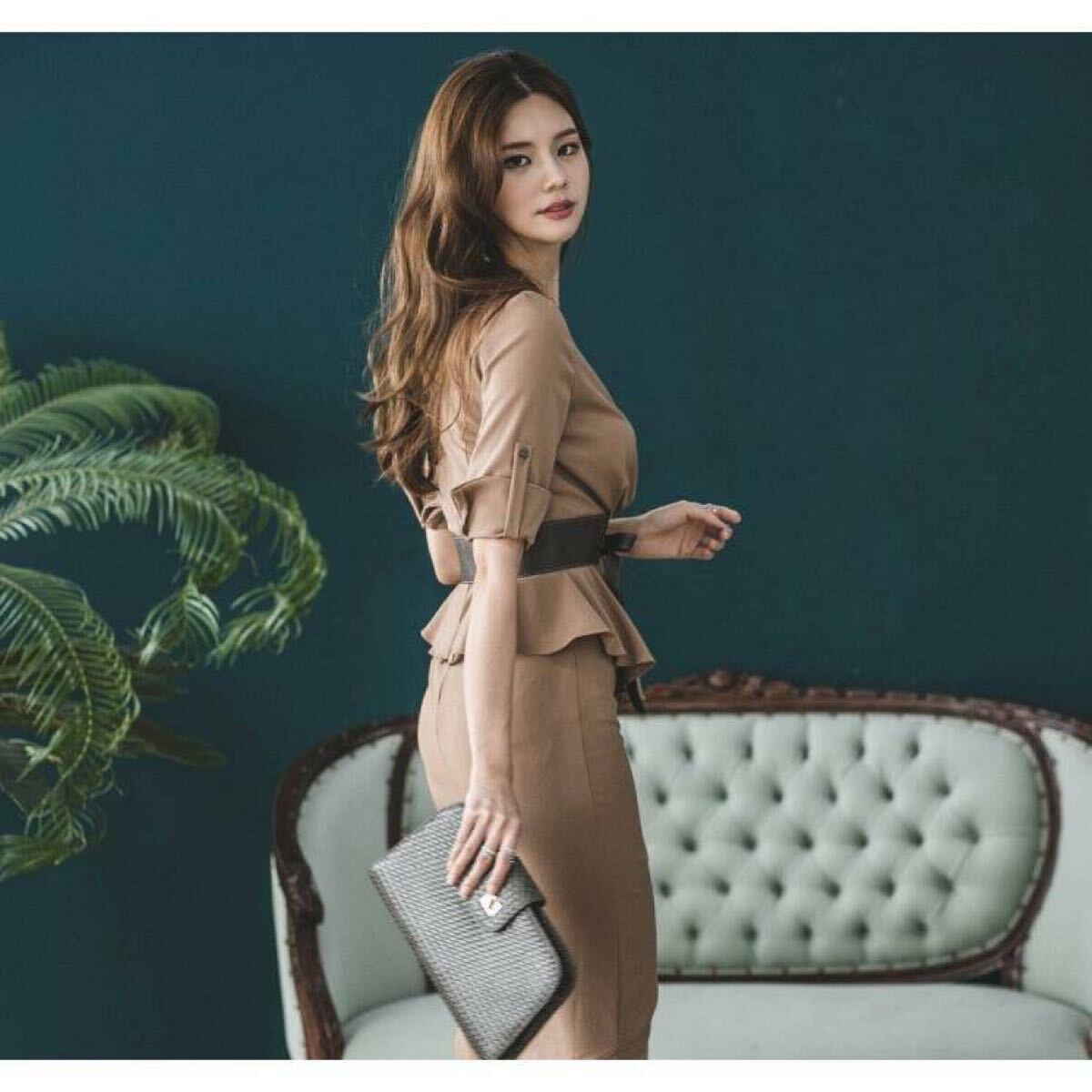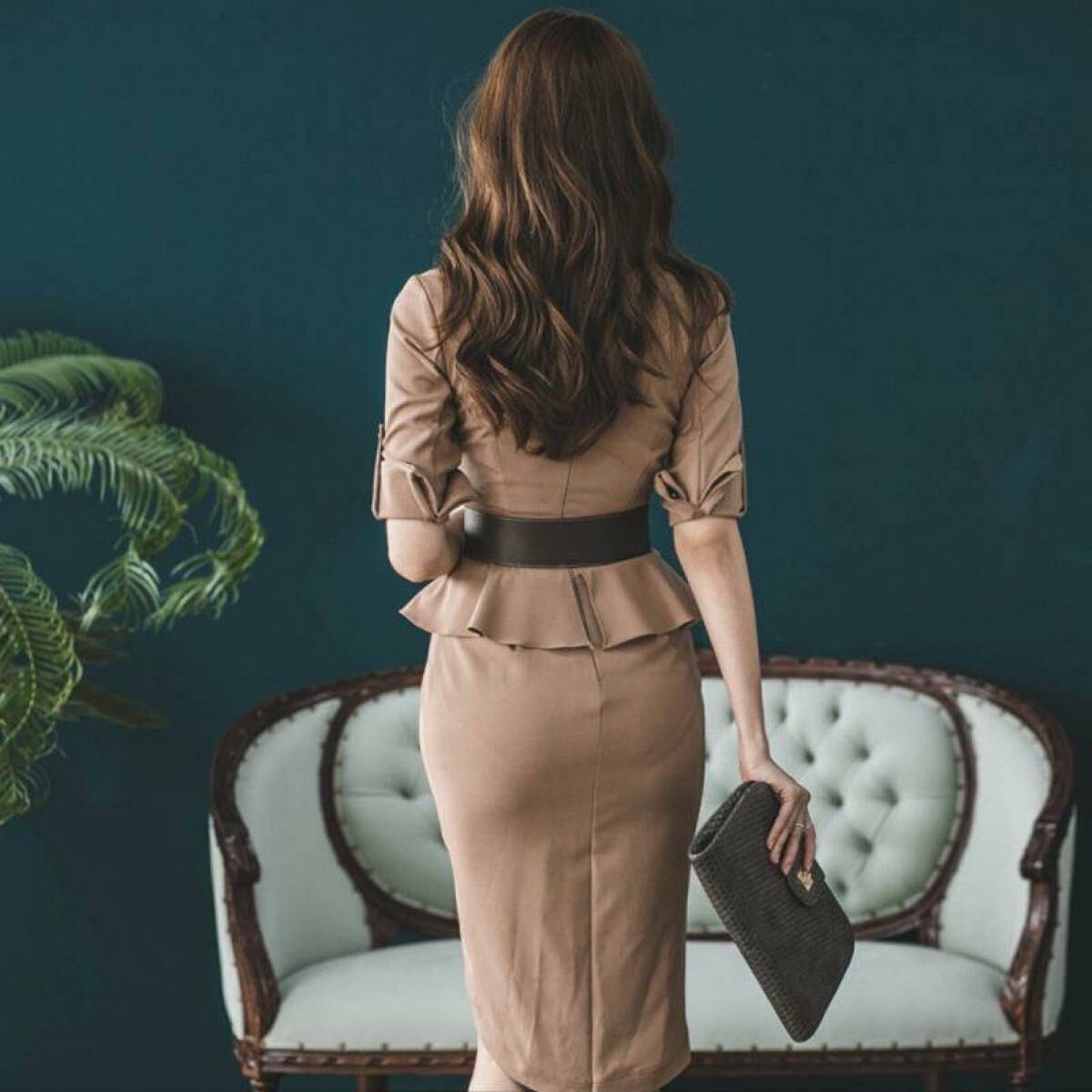 レディースワンピース カシュクール Vネック 細見え スリム 膝丈 エレガント おしゃれ ドレス オフィス ブラウン 茶色 Sサイズ Lサイズ 收藏