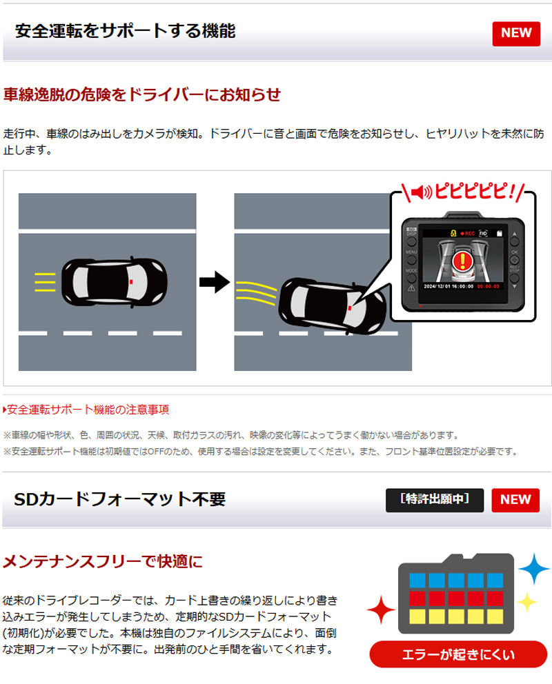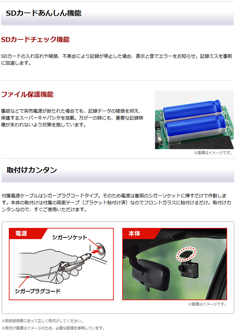 SDカードメンテナンスフリーも搭載され安心です。 <<DRY-ST1250cの特徴>> ・200万画素FULL HD記録&HDR機能 ・車線逸脱の危険をお知らせ[安全運転サポート/ADAS] ・SDカードフォーマット不要 ・取付けカンタン ・駐車中も安心 駐車監視機能(別売オプション) 詳しくはメーカーサイトをご覧ください。 (※出品ページ記載の製品情報や適合情報は製品発売当時の情報となります。必ずメーカーホームページで最新情報をご確認の上ご注文ください。) | ||||||