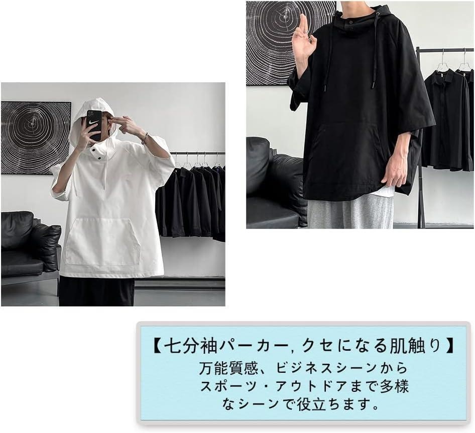 秋の季節のに最適な7部袖のパーカー。肌寒い時にさっと羽織るだけでモードな雰囲気になるパーカーです。 【素材構成】: 100% ポリエステル 【サイズ】: M 長さ31cm バスト130cm 【色】:ブラック 春夏秋の着回しアイテムとして1枚は持っておきたい。 着心地の快適な生地にこだわりました。ロングシーズン着用OKなミニ裏毛の薄手スエット生地は一枚で着ても着心地いい、重ね着風もOKのヘビロテウェア。 程よい伸縮性でストレスフリーな着用感を実現しました。 適度なゆとりがありつつも、だぼつかないからダンスウェアやアクティブウェアとしても◎ユニセックスなアイテムにもOK。 ジーンズ・デニム・ワイドパンツ・チノパンなど様々なパンツ・ボトムとの相性も。 シンプルなデザインで男性魅力をよく見せてくれます。ランニングやウオーキングなどのアウトドアはもちろん、通勤、通学、旅行にも重宝します。 $0.215.1837 2280 パーカー メンズ フード パーカー Tシャツ 夏服 七分袖 無地 大きいサイズ プルオーバーパーカー スウェット カジュアル ゆったり フーディー トレーナー 長袖 柔ら おしゃれ ジャケット 超街人気 春夏秋