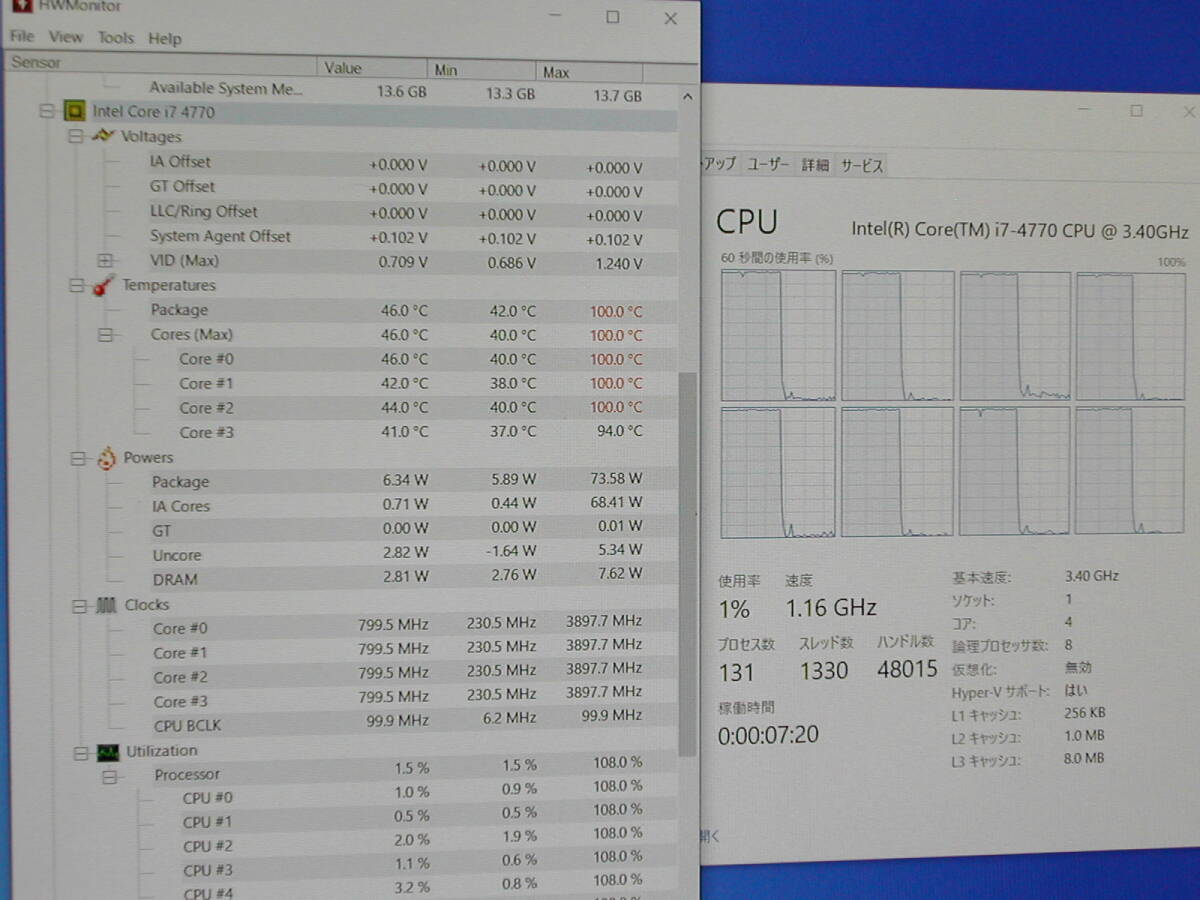 CPUの負荷が分かるソフト画像は検査ソフトをPASSした直後の画像です、このくらいの負荷状態でも普通に動いていました。