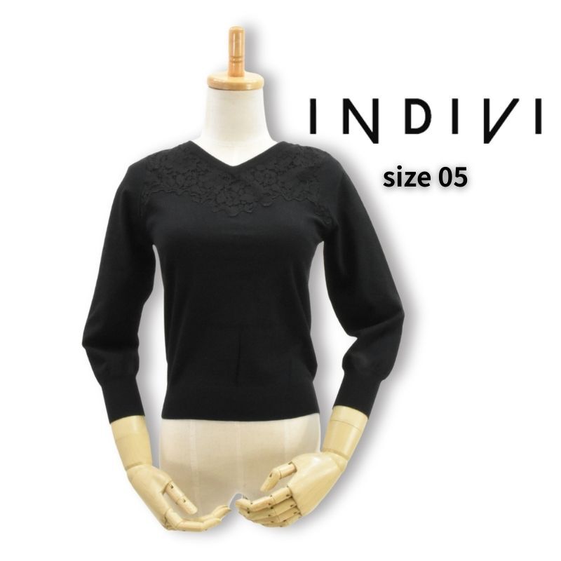 未使用品 インディヴィ レース切替 八分袖ニットプルオーバー サイズ05(S) ブラック INDIVI 收藏