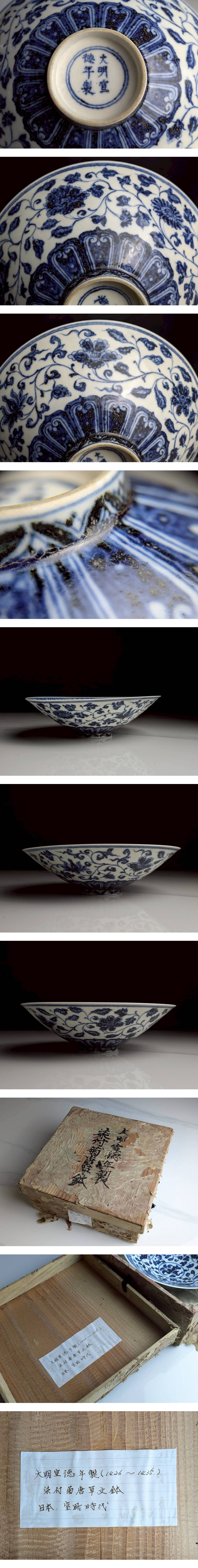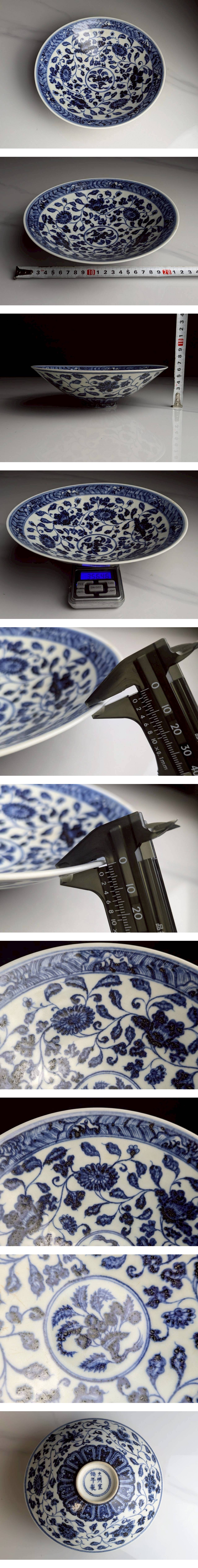 明時代◆大明宣徳年製「染付菊唐草文鉢」直径21.5cm/356g 状態良好 裏表豪華細密絵付 日本室町時代 染付 皿 中国骨董美術品 特別出品 收藏