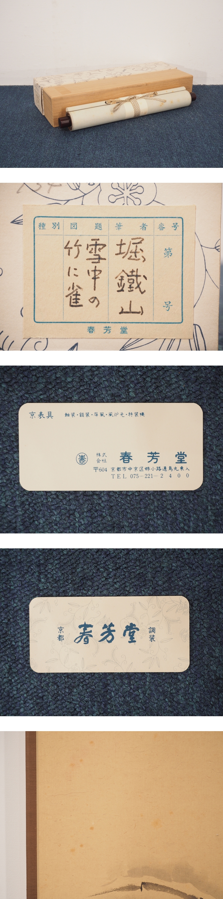 【真作】【渡鹿庵】[堀鉄山] 16676 春芳堂 掛軸 日本画 雪中の竹に雀 合箱 花鳥図 京都 鐵山 在銘 收藏