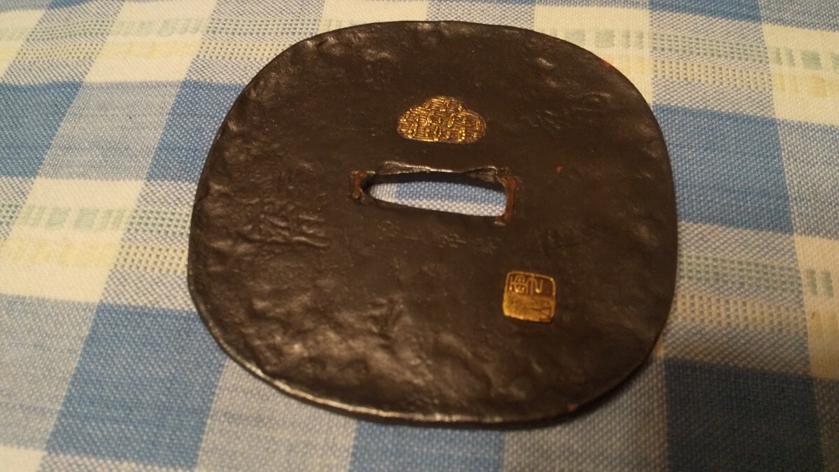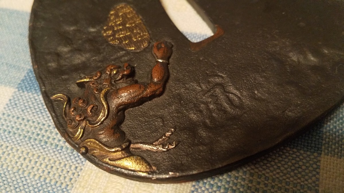 [鍛冶屋敷]/江戸期/象嵌銘 源長常鐫(雪山)/銅地高彫色絵鬼に陰陽師図角丸形鍔/178g/ (検索)骨董/鐔/日本刀/刀装具/縁頭/目貫 收藏
